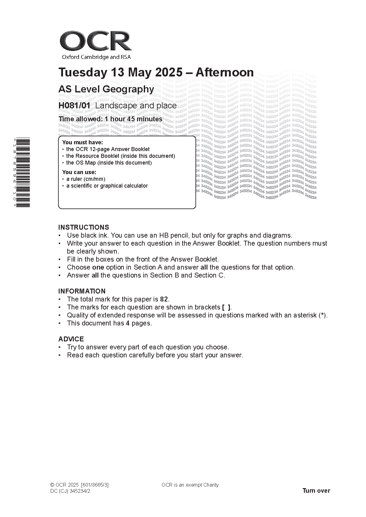 2025 OCR AS Level Geography Paper 1 and Mark Scheme + Insert Combined (H081/01 Landscape and place)