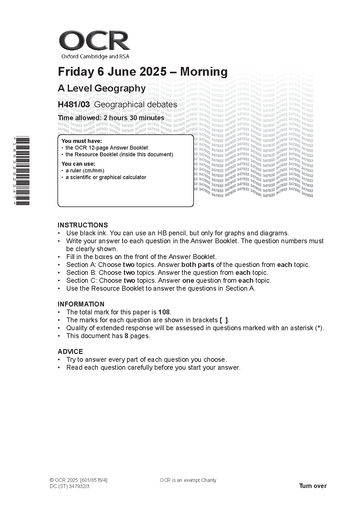 2025 OCR A Level Geography Paper 3 and Mark Scheme + Insert Combined (H481/03 Geographical debates)