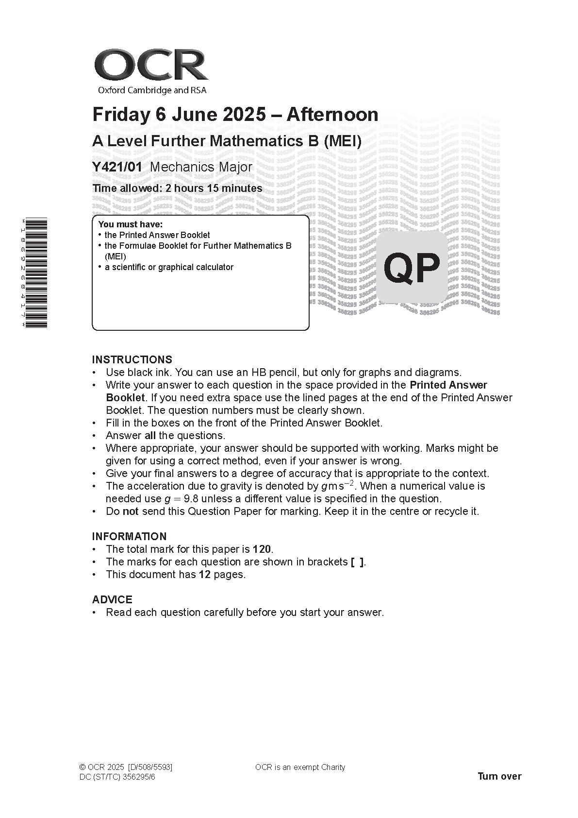 2025 OCR A Level Further Mathematics B (MEI) Paper 1 and Mark Scheme + Insert Combined (Y421/01 Mechanics Major)