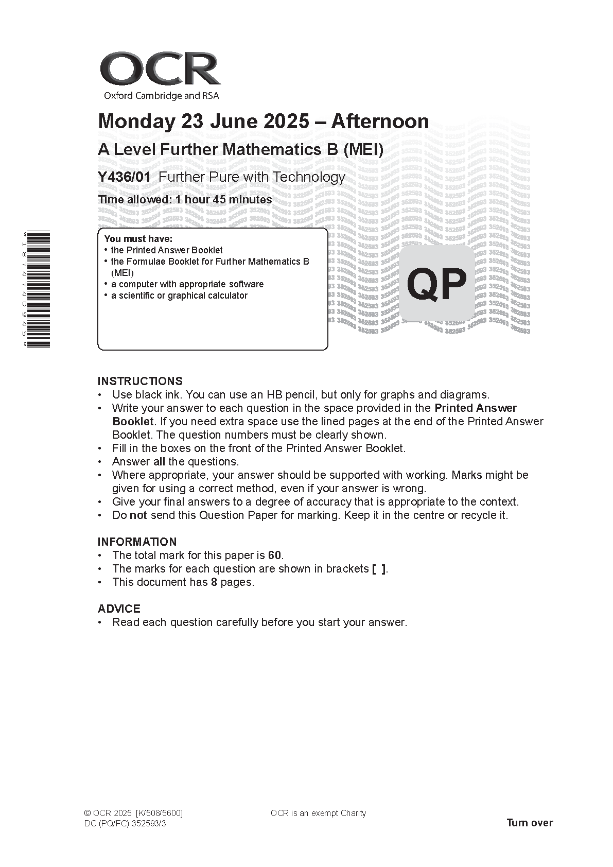 2025 OCR A Level Further Mathematics B (MEI) Paper 1 and Mark Scheme + Insert Combined (Y436/01 Further Pure with Technology)
