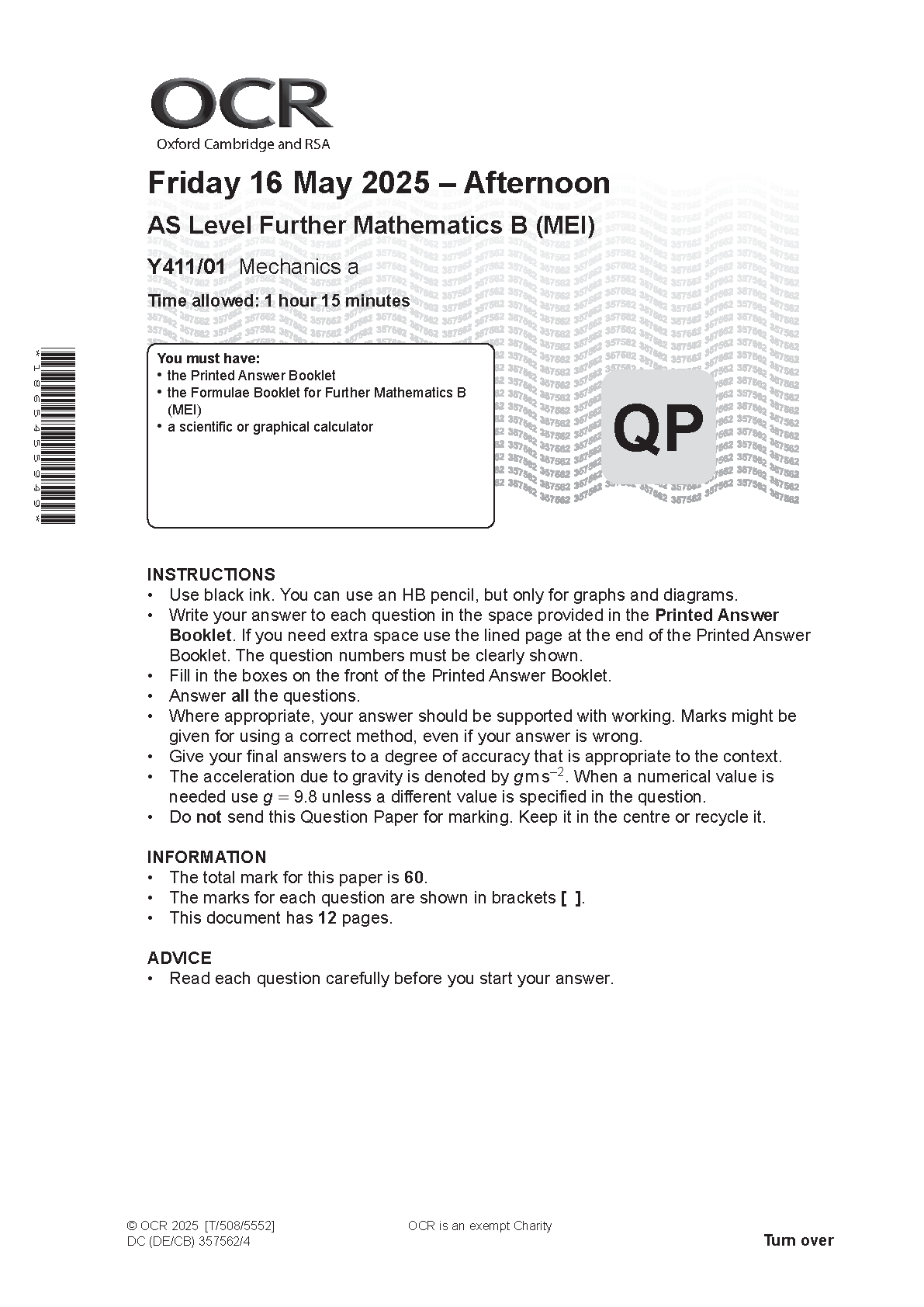 2025 OCR AS Level Further Mathematics B (MEI) Paper 1 and Mark Scheme + Insert Combined (Y411/01 Mechanics a )