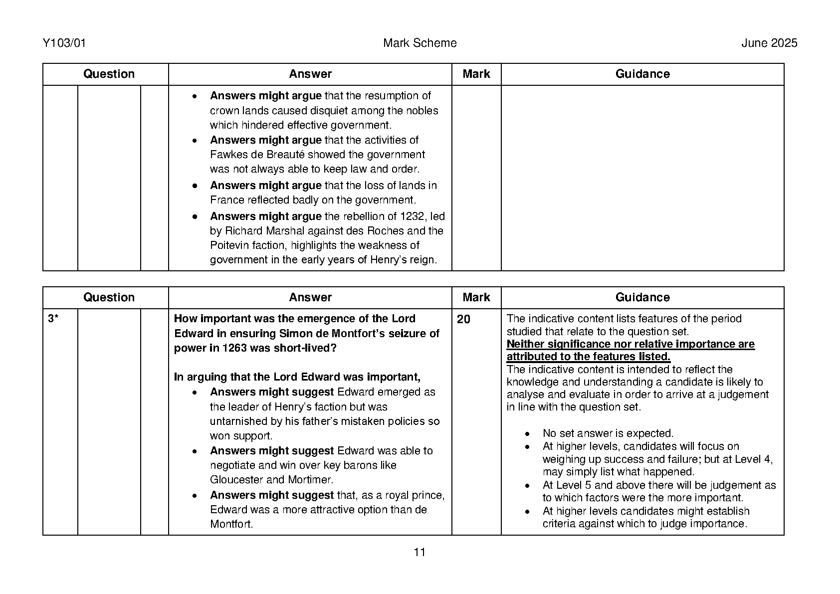 2025 OCR A Level History A Paper 1 and Mark Scheme Combined (Y103/01 England 1199–1272)