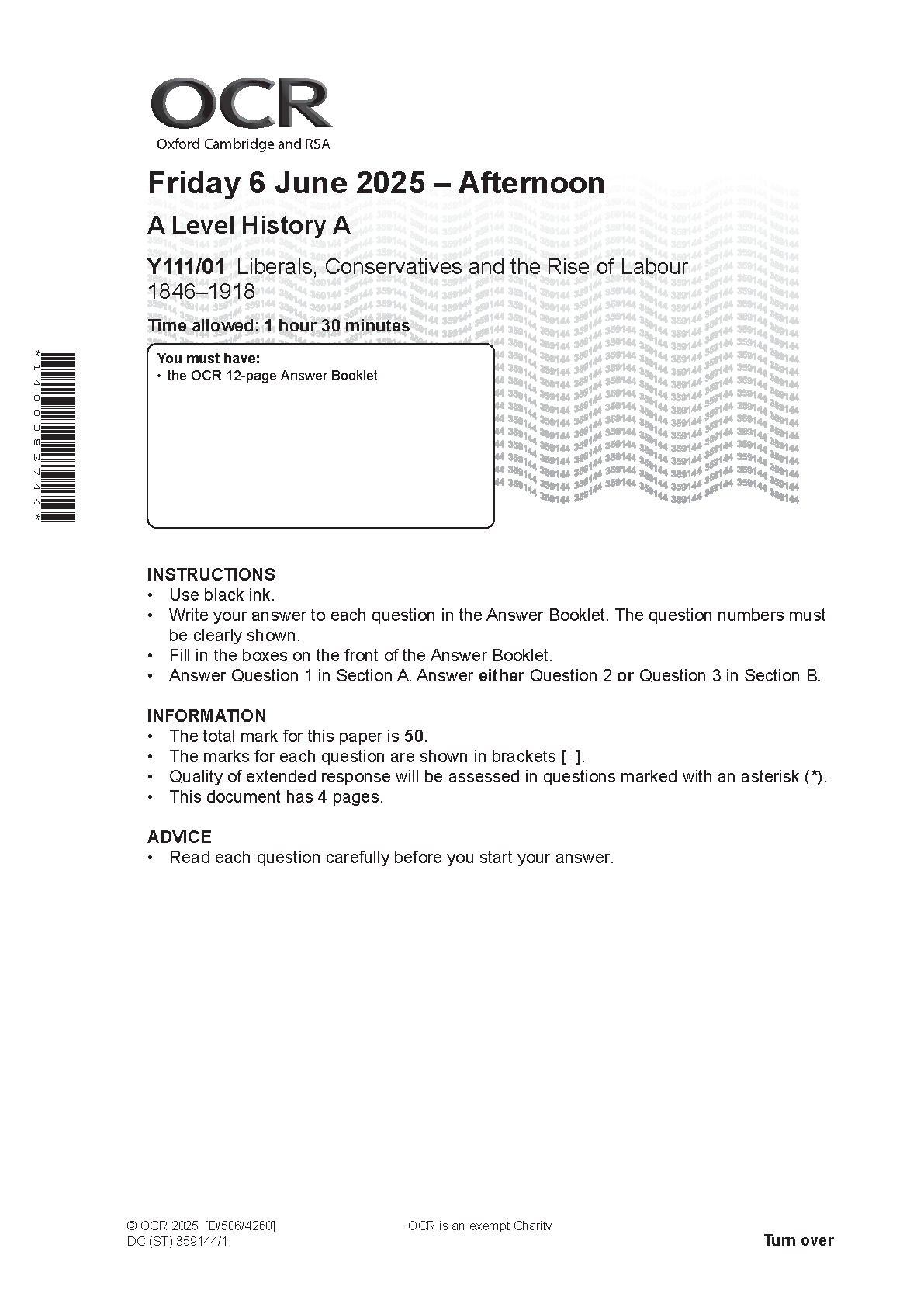 2025 OCR A Level History A Paper 1 and Mark Scheme Combined (Y111/01 Liberals, Conservatives and the Rise of Labour 1846–191)