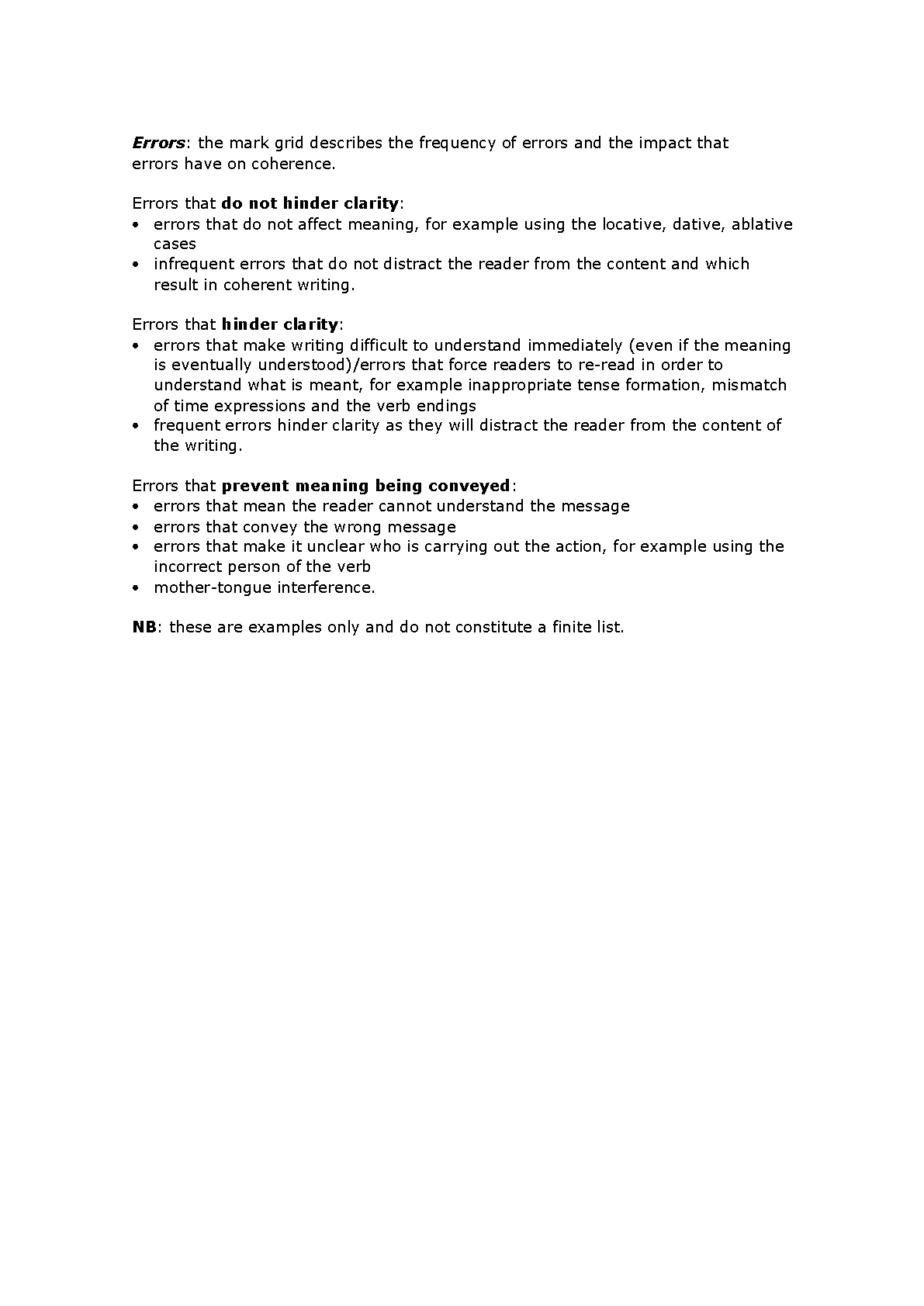 Linguistic accuracy: correct use of basic vocabulary, spelling, verb forms, and simple structures.