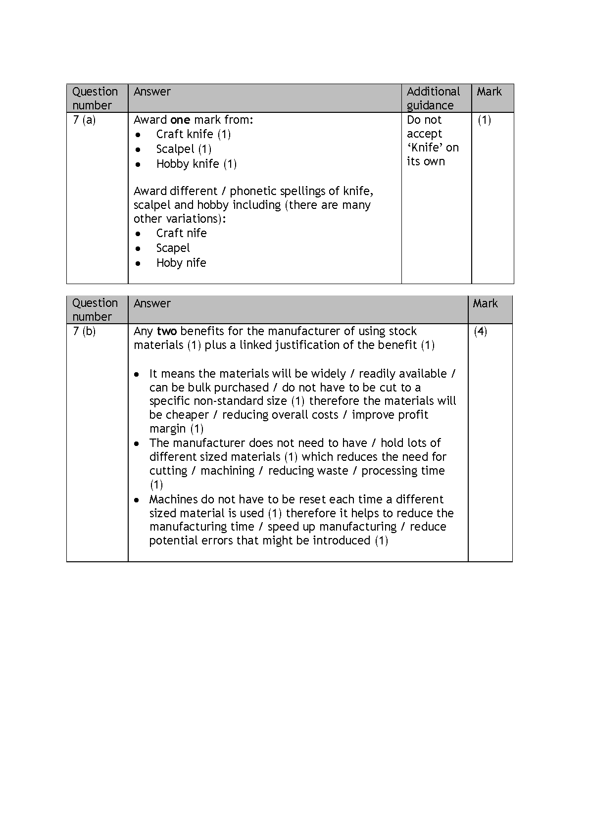 The mark scheme emphasizes correct terminology, understanding of plastic materials, and justification of design decisions