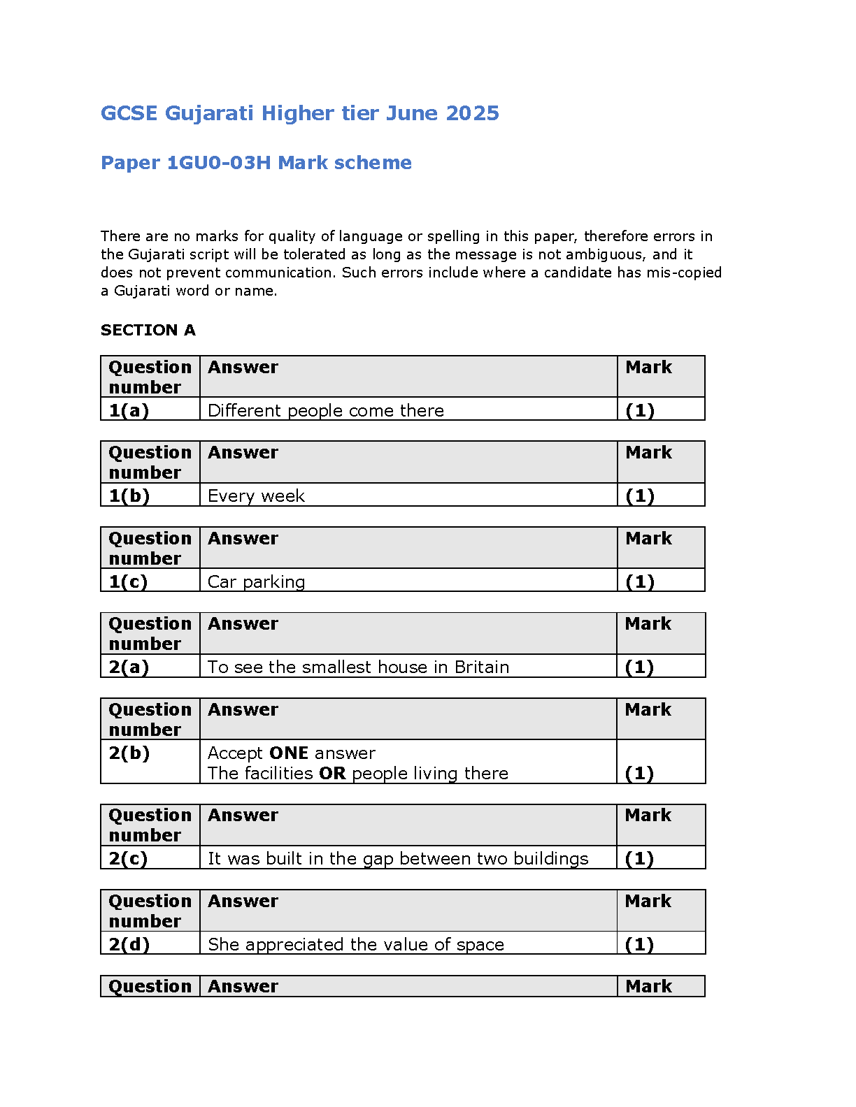 2025 Pearson Edexcel GCSE Gujarati Paper 3H and Mark Scheme Combined (1GU0/3H: Reading and understanding in Gujarati Higher Tier)