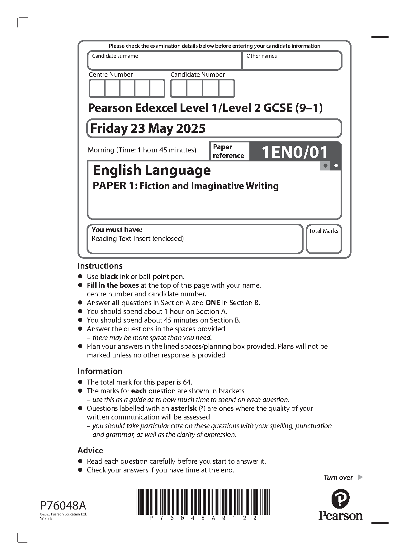 PEARSON EDEXCEL GCSE ENGLISH LANGUAGE PAPER 1 2025 (1EN0/01: Fiction and Imaginative Writing)