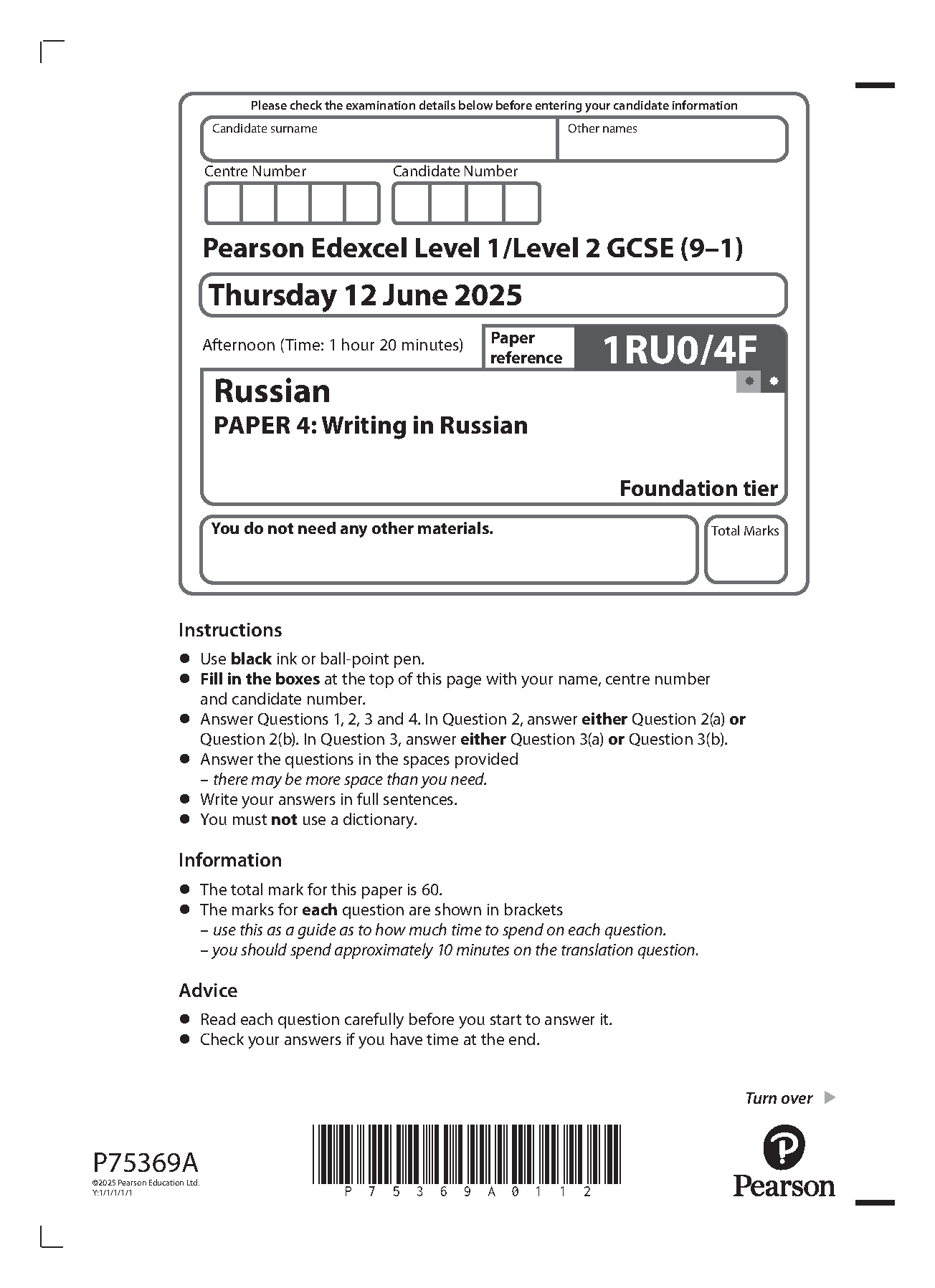 Download the 2025 Pearson Edexcel GCSE Russian Paper 4F (Foundation Tier) question paper and mark scheme for specification 1RU0/4F, focusing on Writing in Russian. This paper is part of the Pearson Edexcel GCSE (9–1) Russian qualification and is designed for Foundation Tier students, targeting grades 1–5.