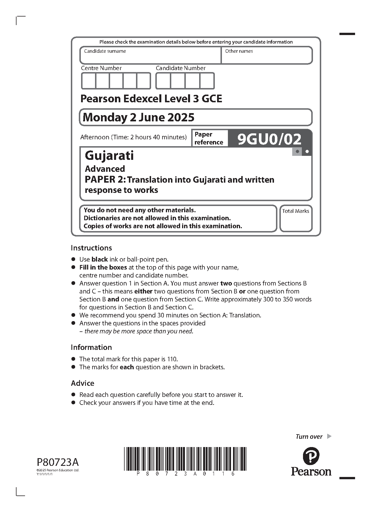 2025 Pearson Edexcel A Level Gujarati Paper 2 and Mark Scheme Combined (9GU0/02: Translation into Gujarati and written response to works)