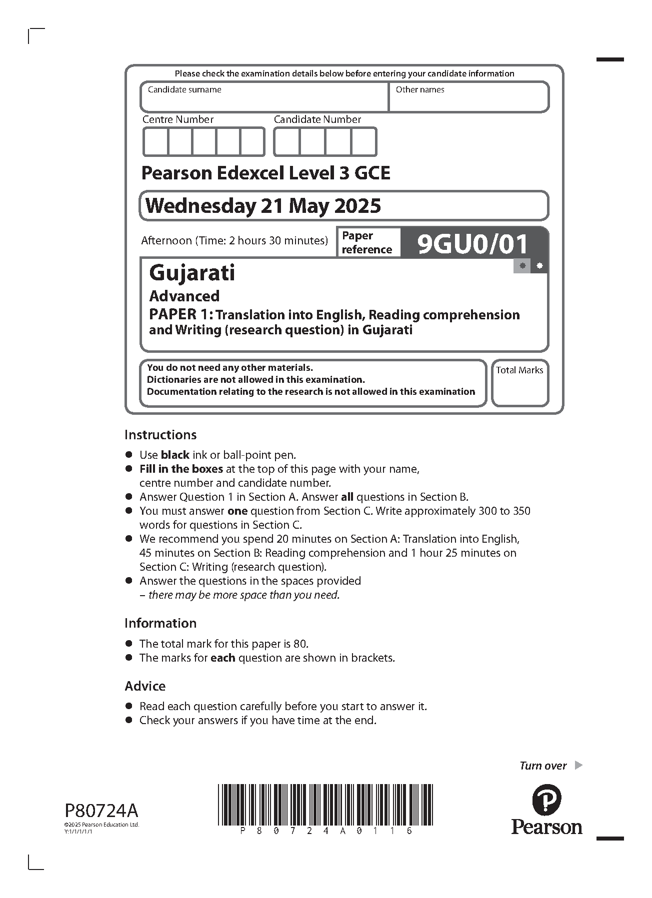 2025 Pearson Edexcel A Level Gujarati Paper 1 and Mark Scheme Combined (9GU0/01: Translation into English, Reading comprehension and Writing (research question) in Gujarati)
