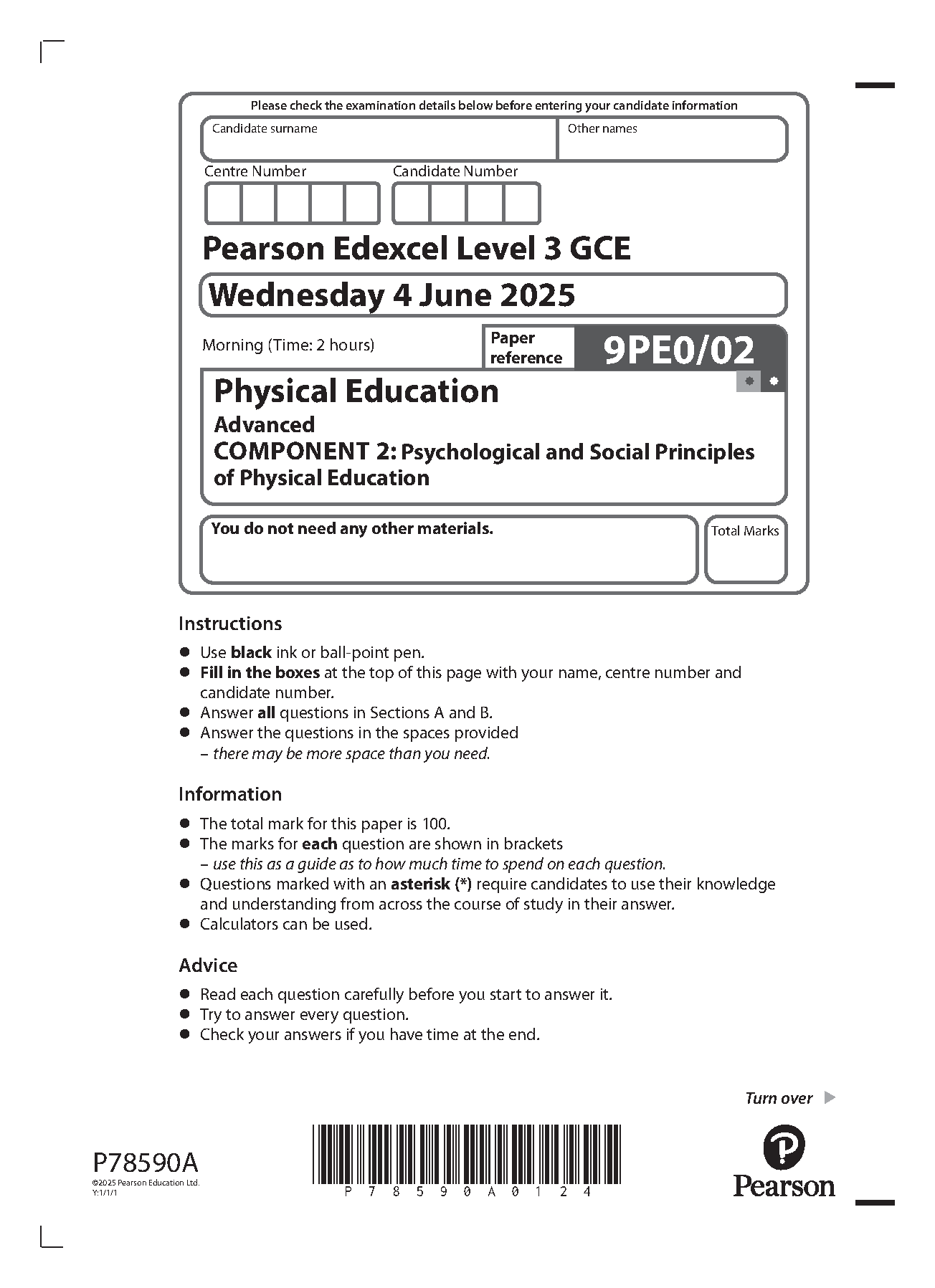 2025 Pearson Edexcel A Level Physical Education Paper 2 and Mark Scheme Combined (9PE0/02: Psychological and Social Principles of Physical Education)