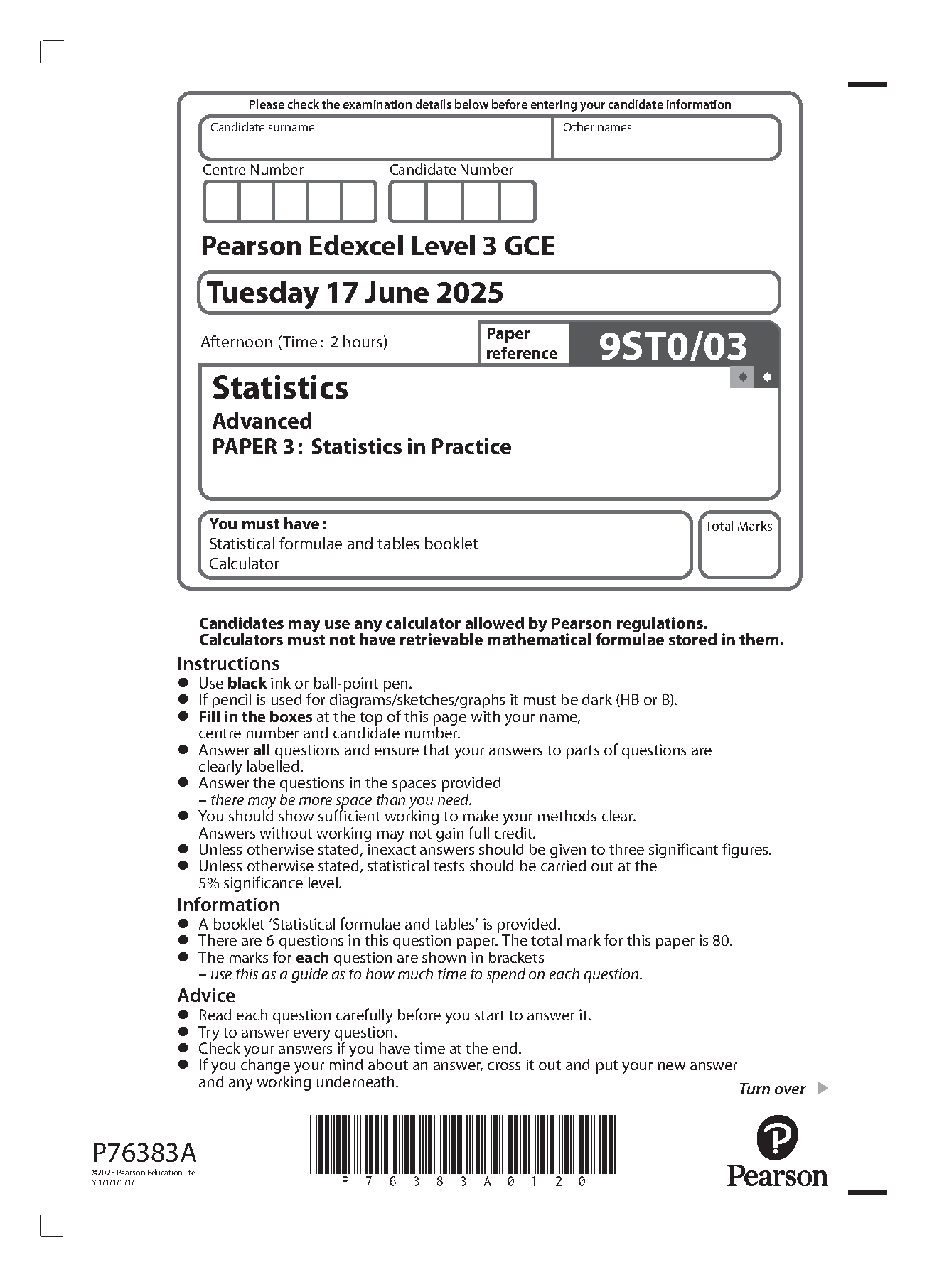 2025 Pearson Edexcel A Level Statistics PAPER 3 and Mark Scheme Combined (9ST0/03: Statistics in Practice)