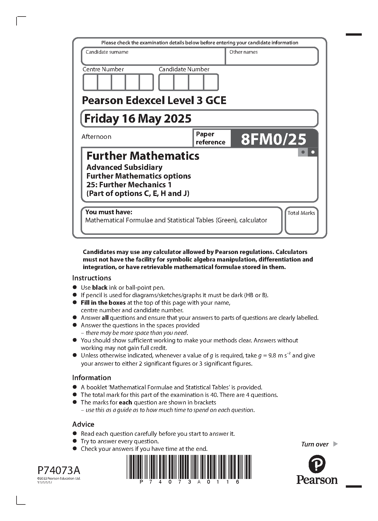 2025 Pearson Edexcel AS Level Further Mathematics Paper 25 and Mark Scheme Combined (8FM0/25 Further Mechanics 1)