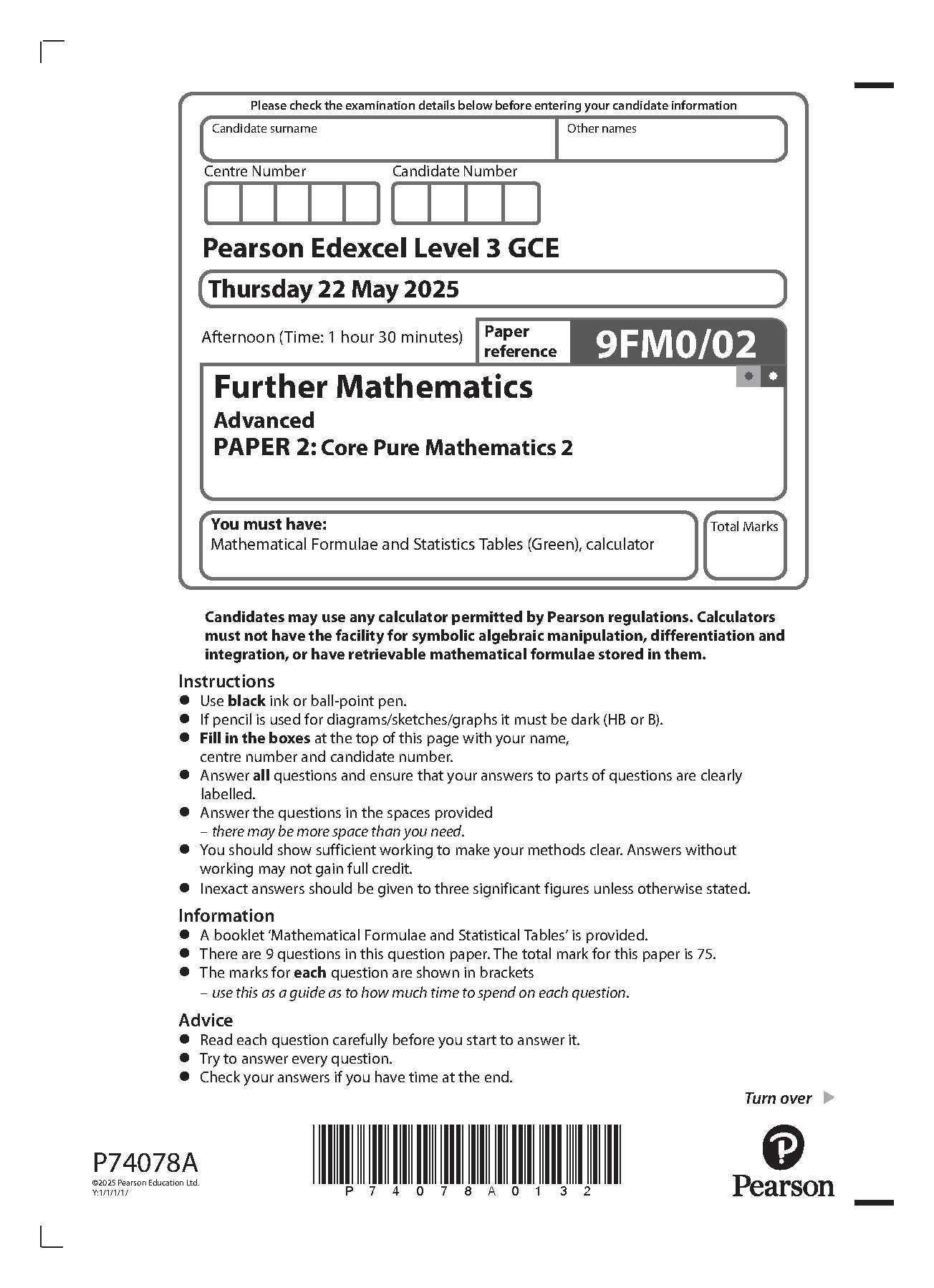 2025 Pearson Edexcel A Level Further Mathematics PAPER 2 and Mark Scheme Combined (9FM0/02: Core Pure Mathematics 2)