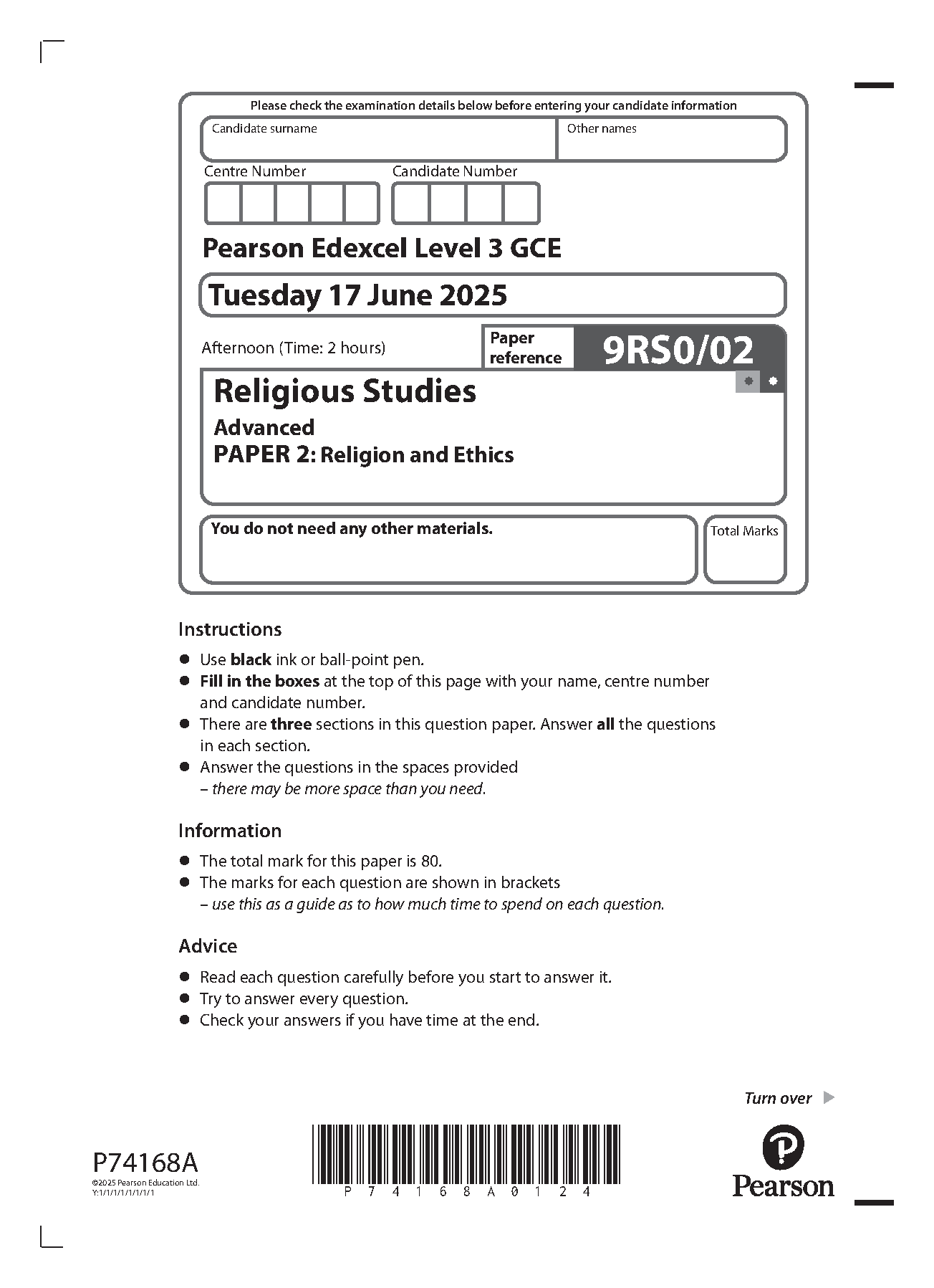 2025 Pearson Edexcel A Level Religious Studies PAPER 2 and Mark Scheme Combined (9RS0/02: Religion and Ethics)