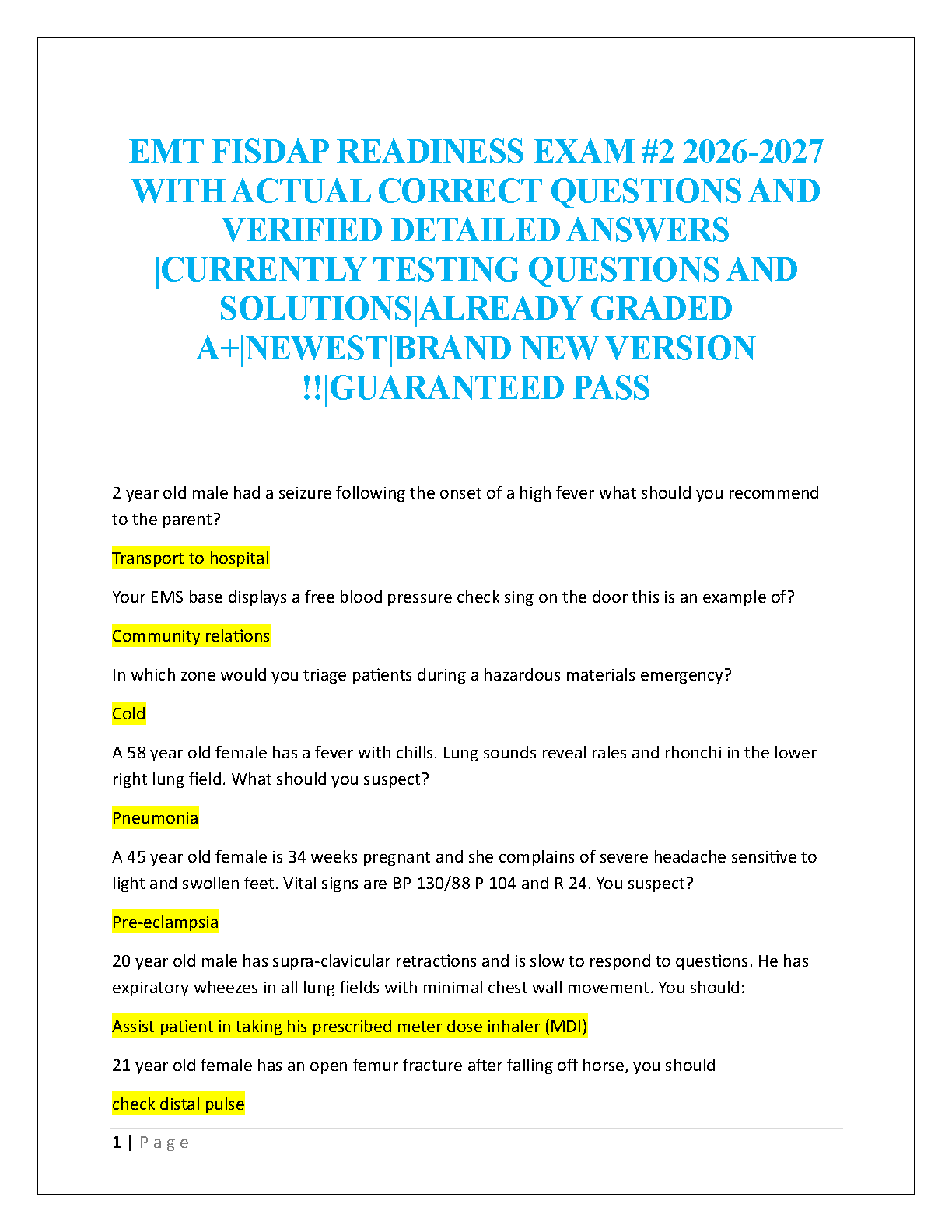 Master the EMT FISDAP Readiness Exam #2 with our latest 2026-2027 test bank. This comprehensive study guide features a complete collection of current, verified questions and detailed, A+ graded answer...