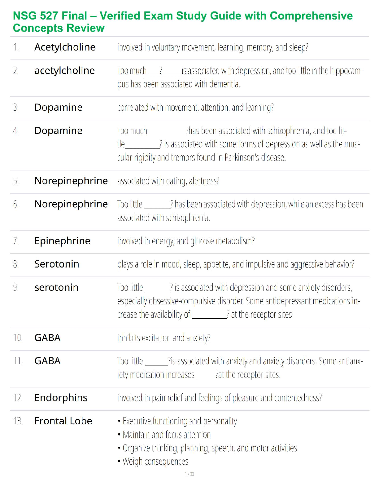 Ace your NSG 527 final exam with this verified and comprehensive study guide, fully updated for the 2025/2026 academic year. This essential resource provides a deep dive into crucial concepts, focusing on neurotransmitters like Acetylcholine, Dopamine, Serotonin, and their roles in various mental health conditions. Master complex topics related to brain function and psychopharmacology to build the confidence you need to pass your exam on the first try and avoid costly resits.