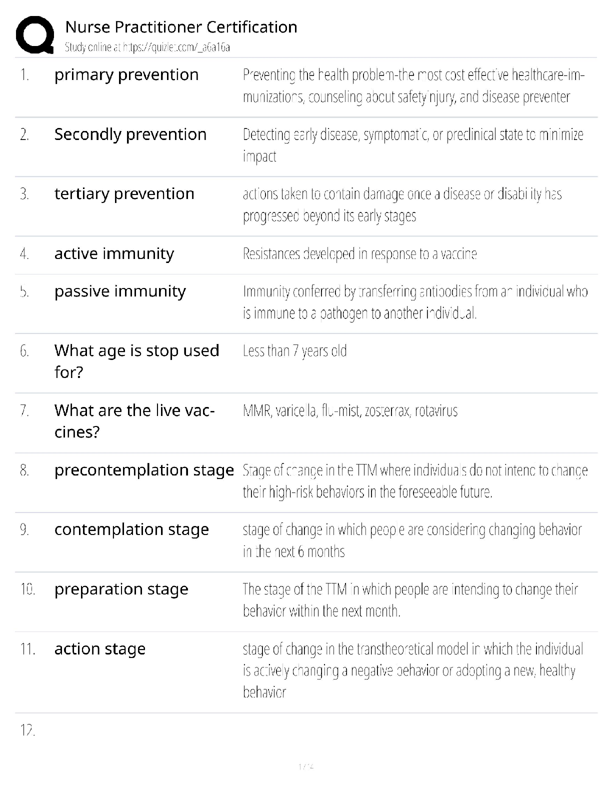 Ace your Nurse Practitioner certification exam with our expertly compiled 2025/2026 study guide! This comprehensive resource simplifies complex topics, ensuring you grasp the essentials needed to pass on your first attempt. Dive deep into crucial concepts such as the three levels of prevention (primary, secondary, tertiary), the distinctions between active and passive immunity, and key information on live vaccines. Additionally, master the stages of the Transtheoretical Model of Change to confidently answer behavioral science questions. This is the ultimate tool to avoid resits and kickstart your NP career, perfect for students preparing for ANCC or AANP boards.