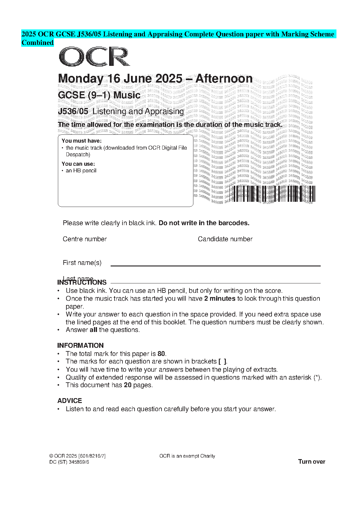 Get exam-ready with the official OCR GCSE (9-1) Music J536/05 Listening and Appraising question paper and complete marking scheme from the June 2025 series. This comprehensive resource is the ultimate study guide for the 2025/2026 academic year. By practicing with this genuine exam paper, you'll gain invaluable insight into the question formats and how to structure your answers to meet the examiners' expectations. The included detailed mark scheme allows you to accurately assess your performance and identify areas for improvement. Master the Listening and Appraising component and walk into your exam with the confidence to secure top marks and pass on your first attempt.