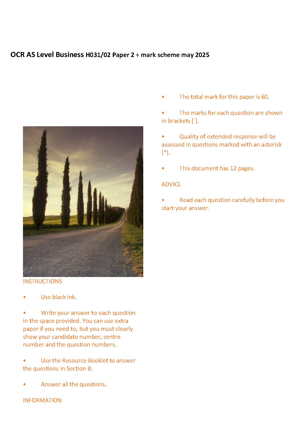 Struggling with OCR AS Level Business? Secure top grades and pass your exams on the first attempt with our comprehensive resource for the 2025/2026 academic year. This package contains the complete OCR AS Level Business Paper 2 (H031/02) question paper from the May 2025 exam session, along with the official, detailed mark scheme. By practicing with this authentic exam paper and understanding the mark scheme, you'll gain crucial insights into question types, examiner expectations, and effective answer structures. This is the perfect tool to refine your exam technique, identify areas for improvement, and eliminate the stress of resits. Download now and get the ultimate preparation material to confidently ace your OCR Business exam.