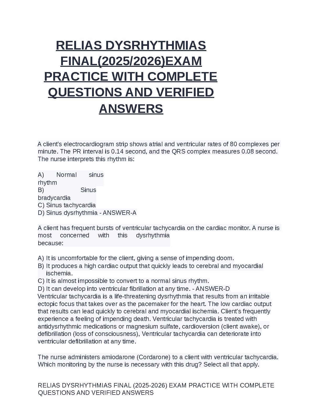 Relias Dysrhythmias Final Exam 2025/2026: A Complete Study Guide with Verified Practice Questions and Detailed Answers for Guaranteed Success
