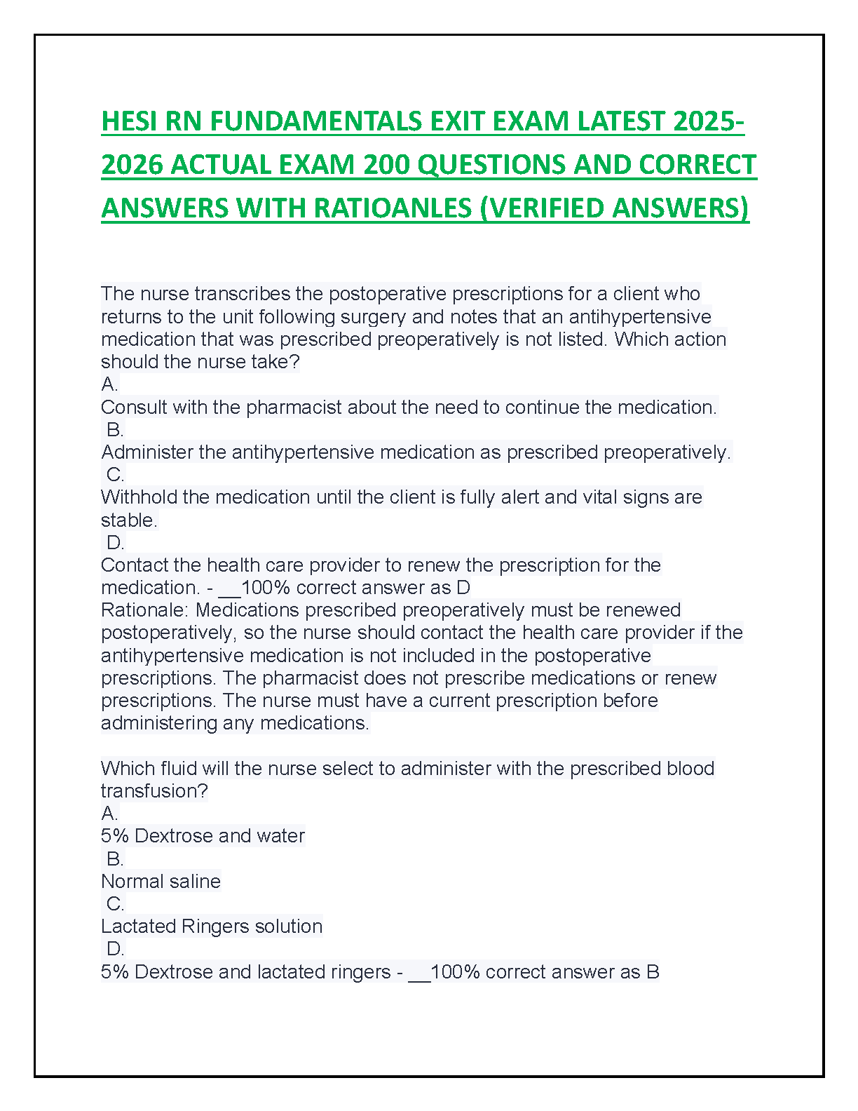 Unlock your potential and guarantee your success on the HESI RN Fundamentals Exit Exam with this premium 2025-2026 study guide. Inside, you'll find a meticulously compiled set of 200 practice questions that mirror the actual exam format. Each question comes with a verified answer and an in-depth rationale, helping you grasp core nursing concepts, not just memorize facts. Prepare effectively, walk into your exam with confidence, and pass with flying colors on your first try!