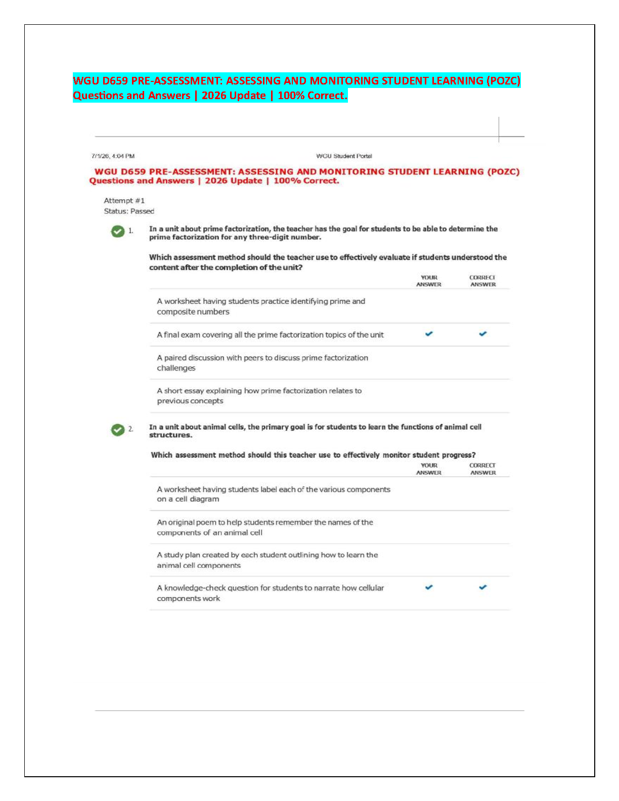 Ace your WGU D659 Pre-Assessment with our comprehensive study guide for 2026. This resource contains the latest questions and 100% verified correct answers for the 'Assessing and Monitoring Student Learning (POZC)' course. Prepare efficiently, master the key concepts, and pass your exam with confidence. This is the ultimate tool to help you succeed in your WGU studies and move forward in your program without delay.