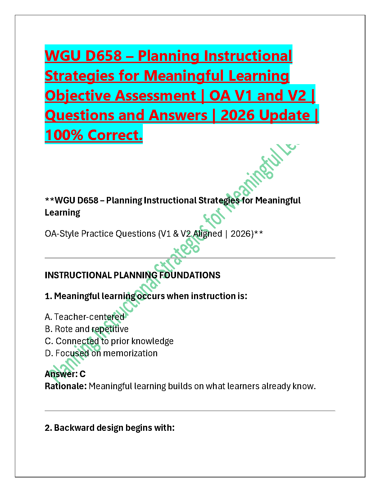 Excel in your WGU D658 course with this ultimate study guide for the 'Planning Instructional Strategies for Meaningful Learning' Objective Assessment. This comprehensive test bank is your key to success, featuring a complete set of questions and answers aligned with the latest 2025/2026 curriculum, covering both V1 and V2 of the OA. Each question comes with a detailed, verified rationale to ensure you not only know the right answer but also understand the core concepts. Prepare effectively, build confidence, and pass your exam on the first attempt with this essential resource.