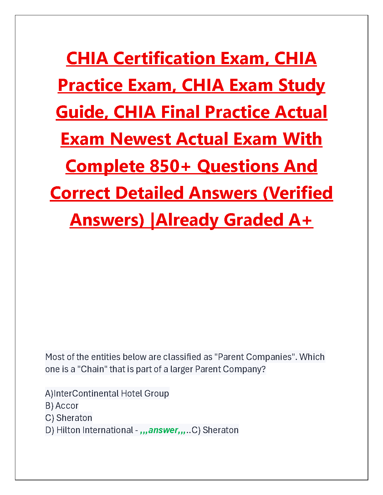 Ace your Certification in Hotel Industry Analytics (CHIA) exam on the very first try with our ultimate 2025/2026 test bank! This comprehensive study guide provides you with an extensive collection of over 850 real exam questions, complete with detailed, verified answers. Each question has been carefully selected to mirror the actual CHIA exam, ensuring you are fully prepared. Our A+ graded material covers all essential topics, helping you master the concepts and pass with confidence. Avoid resits and secure your certification with this essential preparation tool.