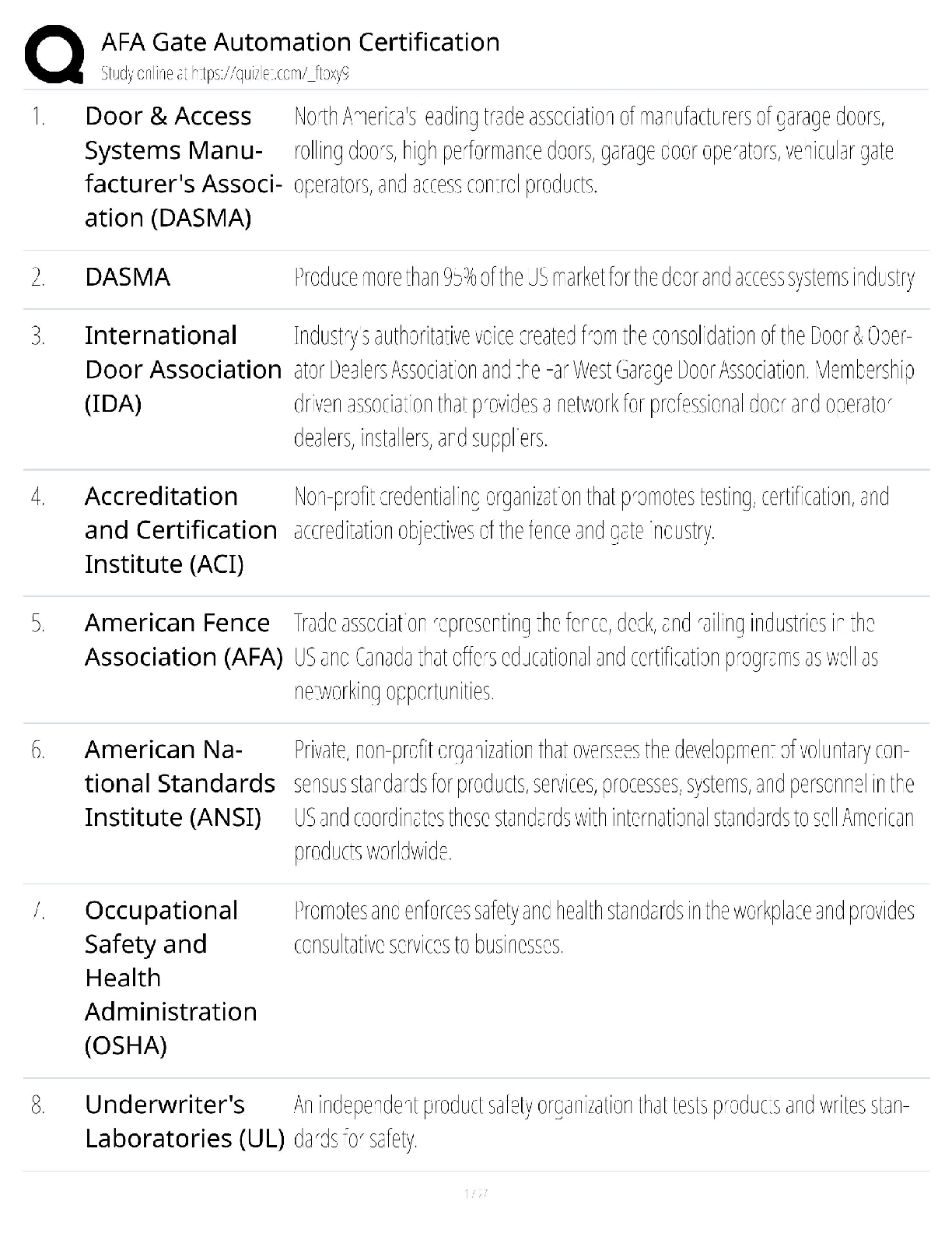 Master the AFA Gate Automation Certification exam with our newly released 2025/2026 study guide. This comprehensive resource provides detailed elaborations on all critical organizations and standards you need to know, including DASMA, IDA, ANSI, OSHA, and UL. This guide is specifically designed to help you pass on your first attempt by breaking down complex terminology into easy-to-understand definitions, covering everything from manufacturing associations to essential safety standards. Avoid resits and fast-track your professional certification with this essential exam preparation tool.