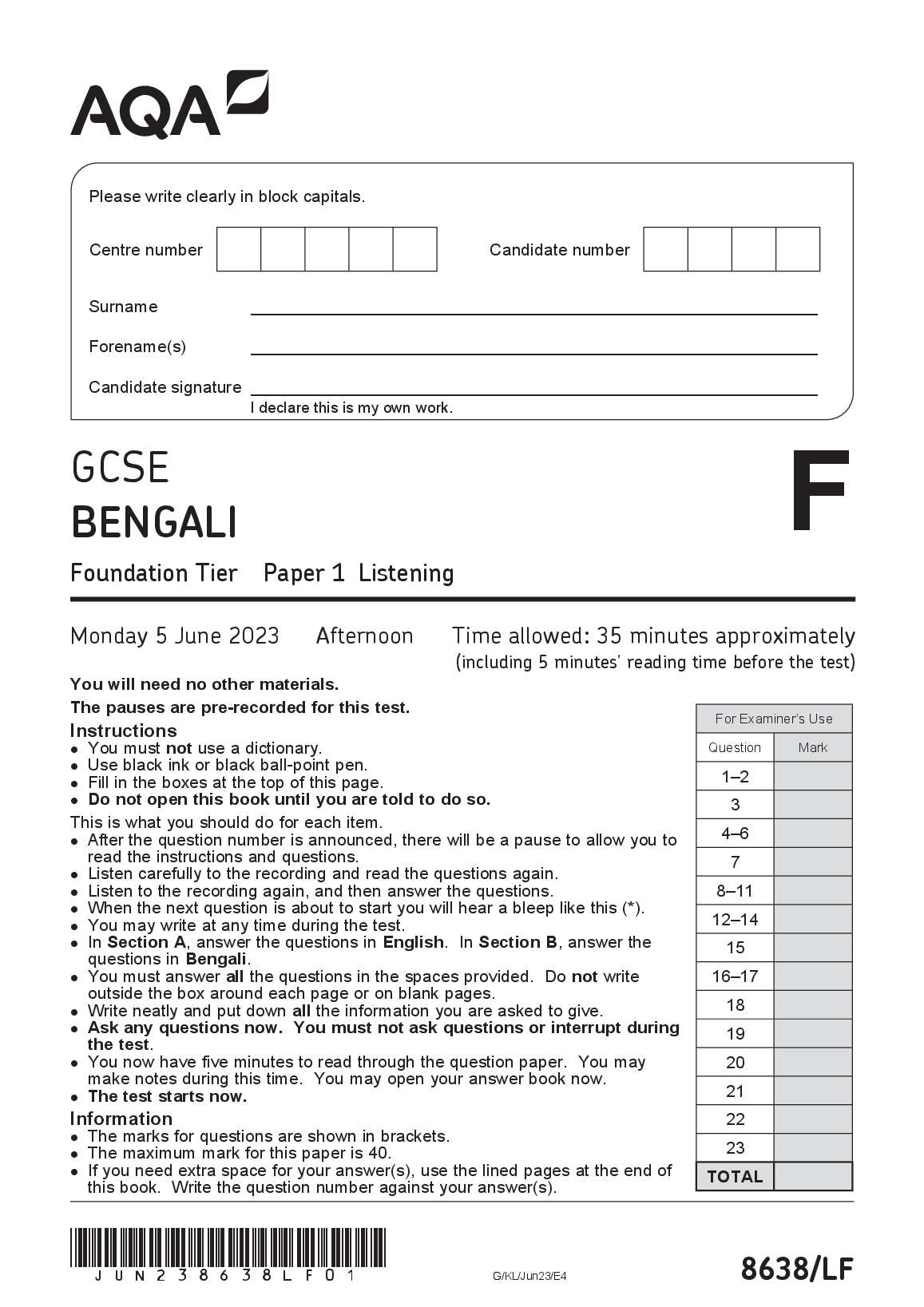 AQA GCSE BENGALI PAPER 1 QUESTION PAPER 2023 (8638/LF: FOUNDATION TIER). DOWNLOAD OFFICIAL AND VERIFIED AQA GCSE BENGALI PAPER 1 MARK SCHEME 2023 ON www.leakedexams.com.