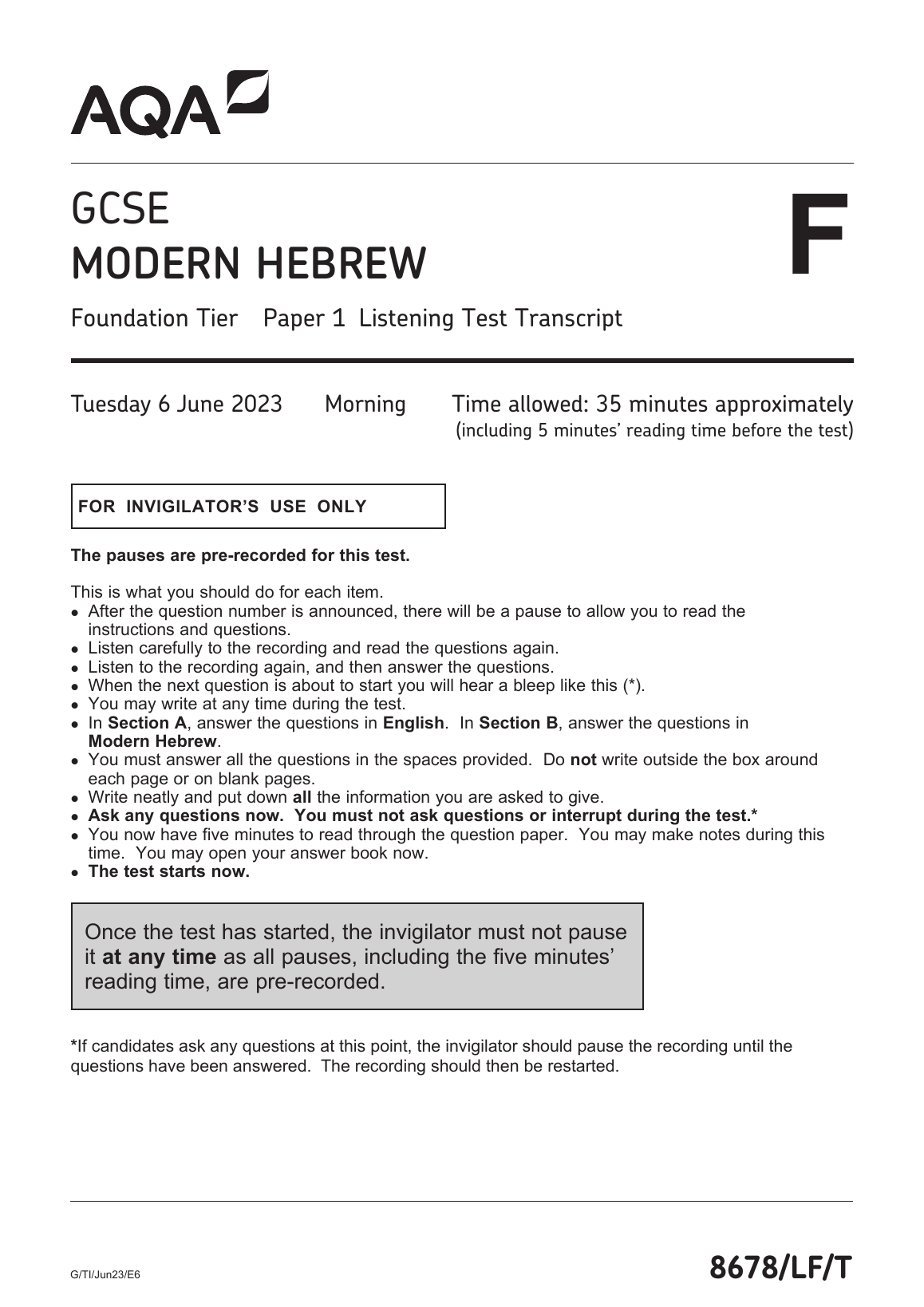 AQA GCSE MODERN HEBREW PAPER 1 Listening Test Transcript 2023 (8678/LF: Listening - Foundation Tier). DOWNLOAD OFFICIAL AND VERIFIED AQA GCSE MODERN HEBREW PAPER 1 Listening Test Transcript 2023 ON www.leakedexams.com.