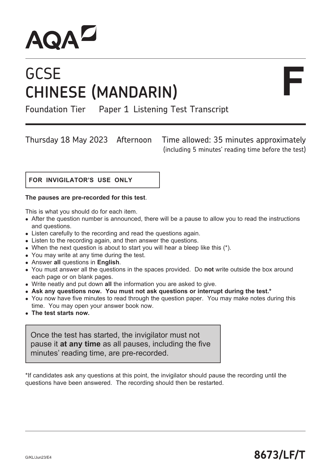 AQA GCSE CHINESE (MANDARIN) PAPER 1 Â Listening Test Transcript 2023 (8673/LF: Listening - Foundation Tier). DOWNLOAD OFFICIAL AND VERIFIED AQA GCSE CHINESE (MANDARIN) PAPER 1 Â Listening Test Transcript 2023 ON www.leakedexams.com.