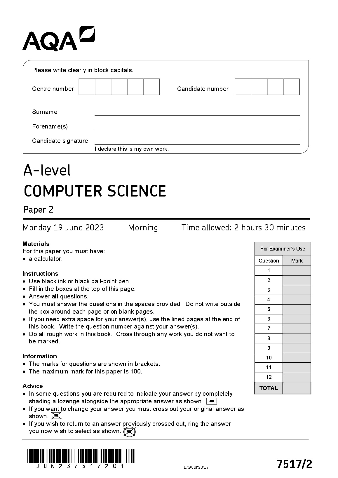 AQA A LEVEL COMPUTER SCIENCE PAPER 2 JUNE 2023 (7517/2). AQA A LEVEL COMPUTER SCIENCE PAPER 2 JUNE 2023 (7517/2) AQA A/As Level Question Paper