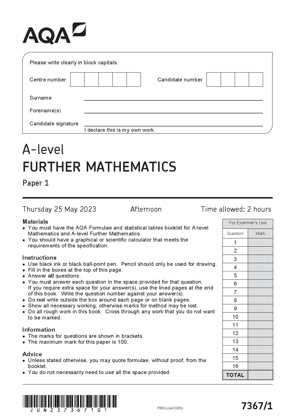 2023 AQA A LEVEL FURTHER MATHEMATICS QUESTION PAPER 1(7367/1).. 2023 AQA A LEVEL FURTHER MATHEMATICS QUESTION PAPER 1(7367/1). AQA A/As Level Question Paper