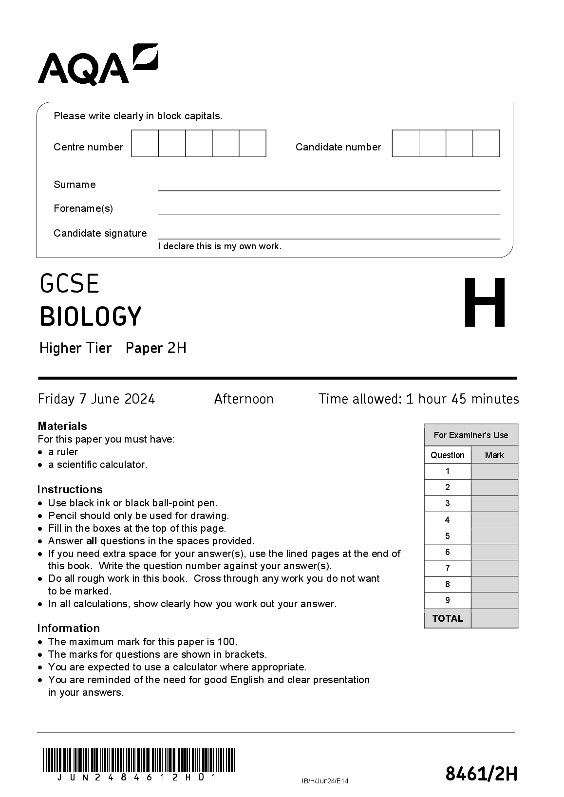 2024 AQA GCSE BIOLOGY PAPER 2 QP (8461/2H:HIGHER TIER). 2024 AQA GCSE BIOLOGY PAPER 2 QP (8461/2H:HIGHER TIER) GCSE QUESTION PAPER