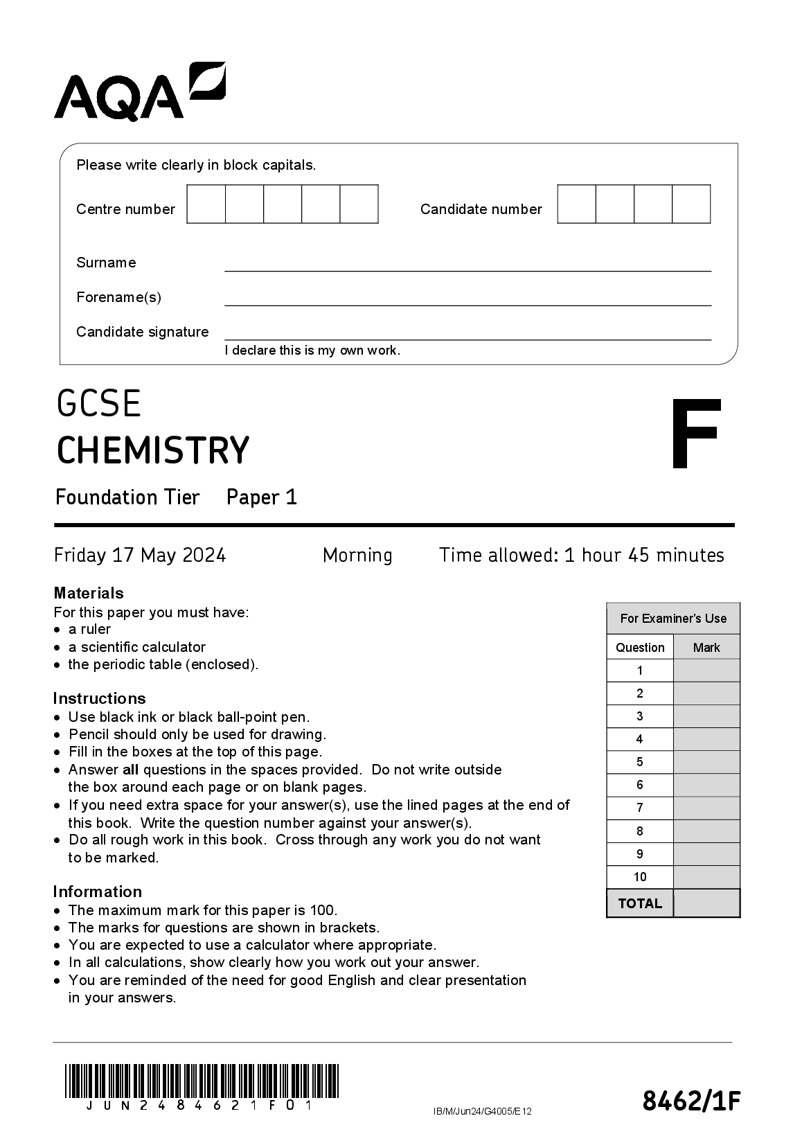 2024 aqa gcse chemistry paper 1 qp(8462/1f: foundation tier)