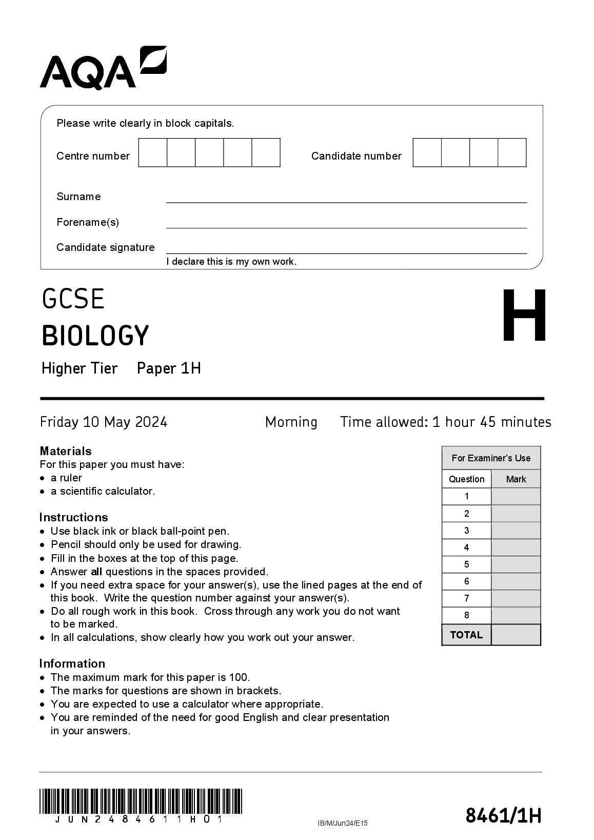 2024 AQA GCSE BIOLOGY PAPER 1 QP (8461/1H:HIGHER TIER). 2024 AQA GCSE BIOLOGY PAPER 1 QP (8461/1H:HIGHER TIER) GCSE QUESTION PAPER