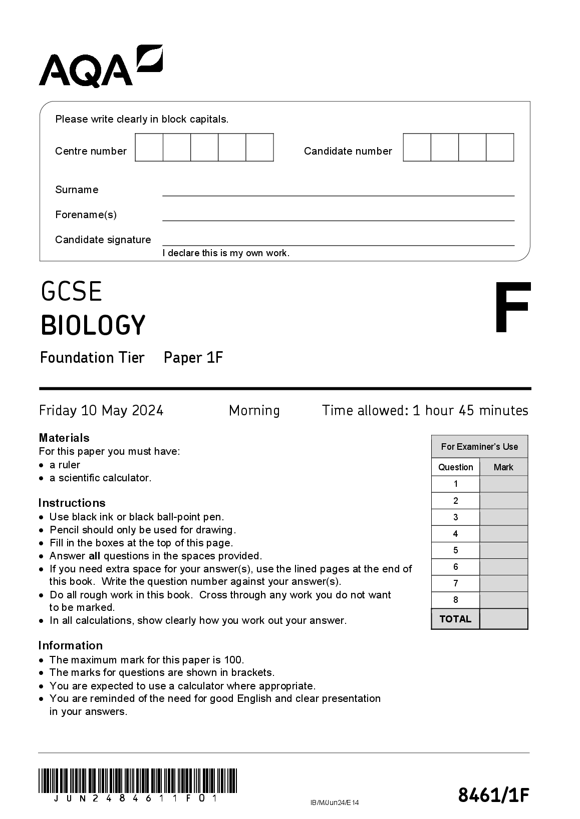 2024 AQA GCSE BIOLOGY Paper 1F QP(8461/1F: Foundation Tier). 2024 AQA GCSE BIOLOGY Paper 1F QP(8461/1F: Foundation Tier) GCSE QUESTION PAPER