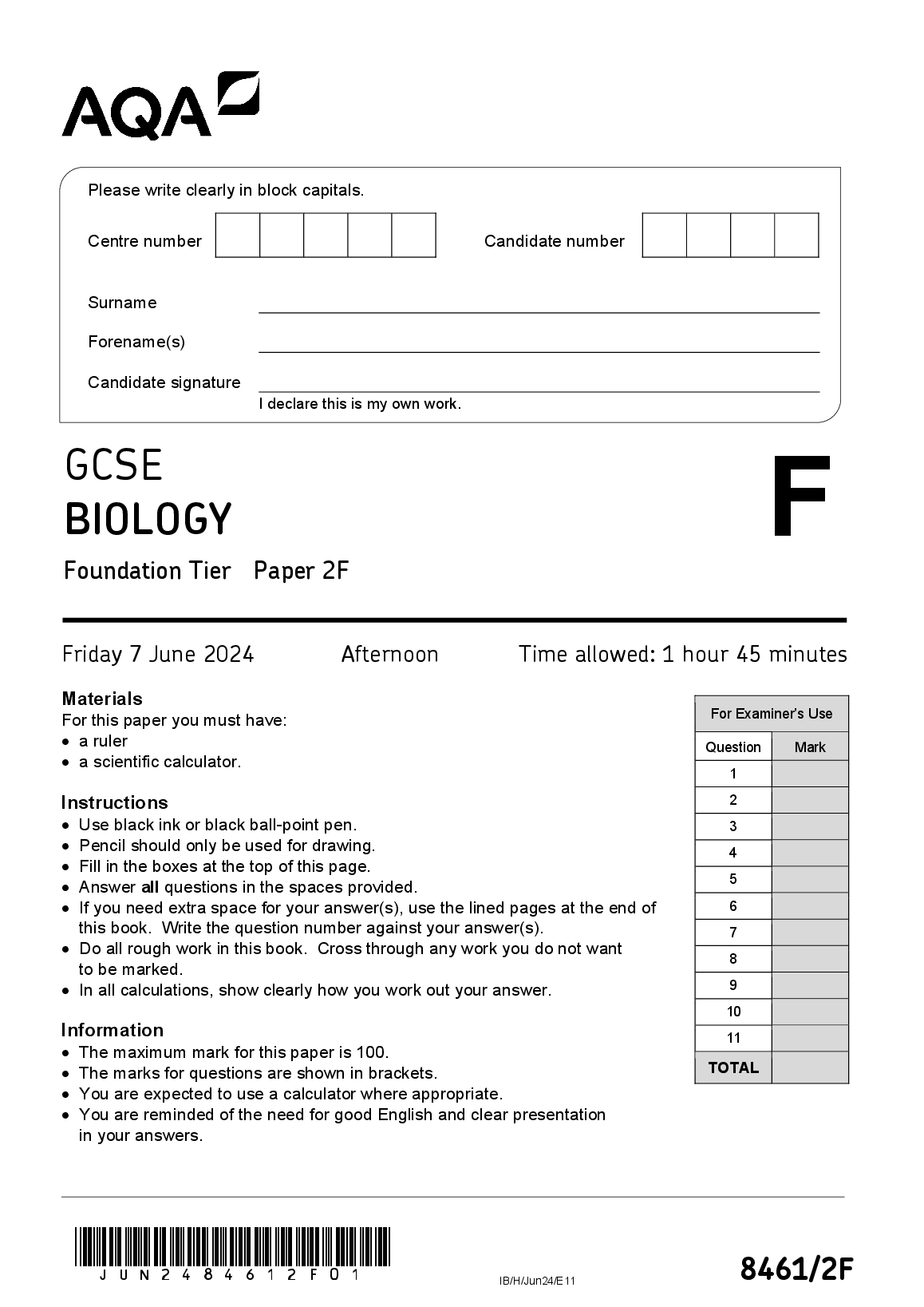 2024 AQA GCSE BIOLOGY Paper 2F QP(8461/2F: Foundation Tier). 2024 AQA GCSE BIOLOGY Paper 2F QP(8461/2F: Foundation Tier) GCSE QUESTION PAPER