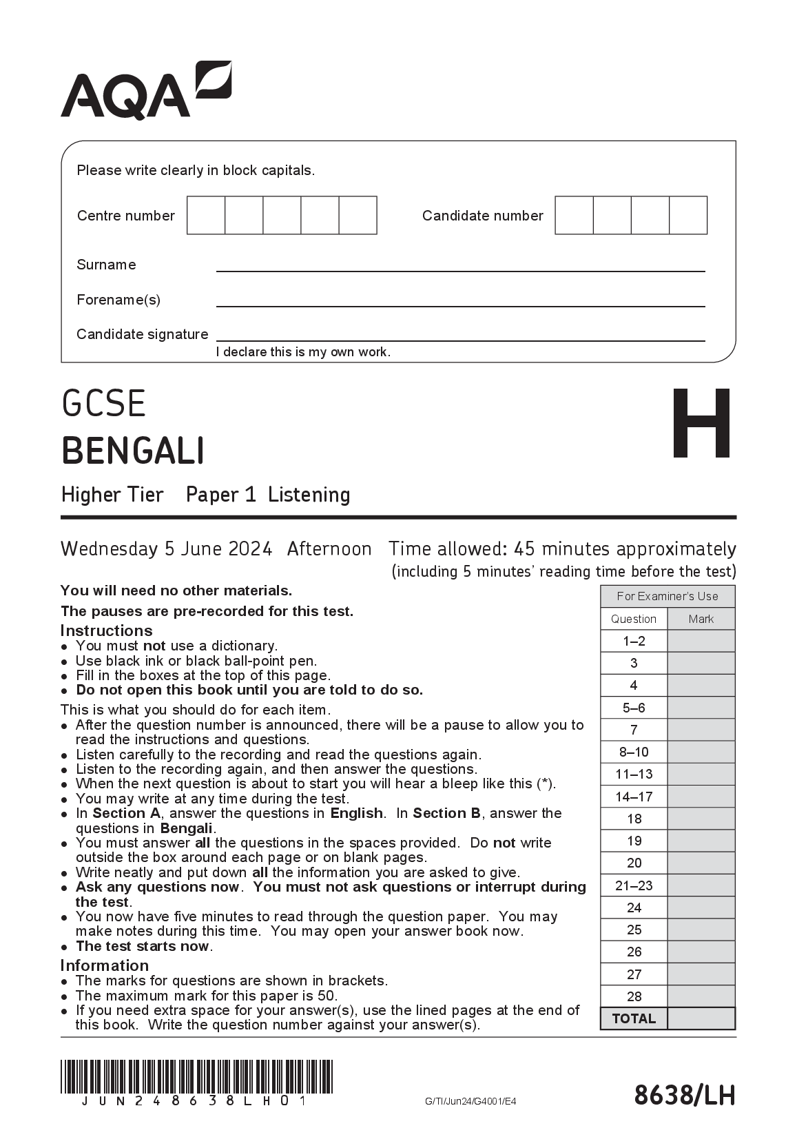 2024 aqa gcse bengali paper 1 listening qp(8638/lh:higher tier)