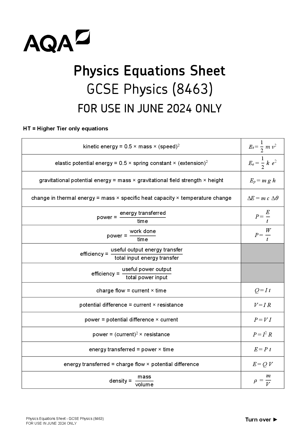2024 AQA GCSE PHYSICS EQUATION SHEET(8463:INSERT). 2024 AQA GCSE PHYSICS EQUATION SHEET(8463:INSERT) INSERT CONTENT PAPER