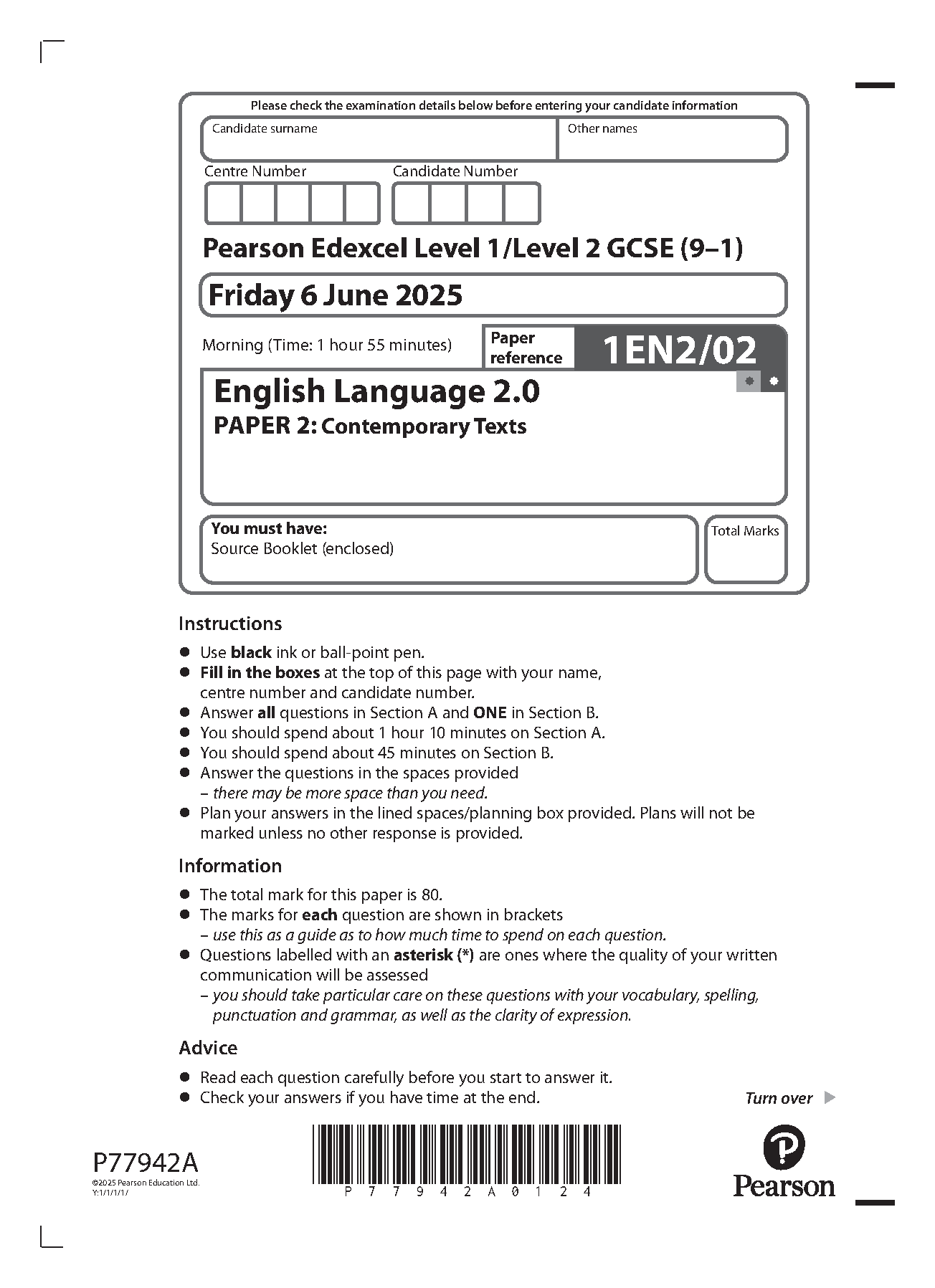 2025 Pearson Edexcel GCSE English Language 2.0 Paper 2 and Mark Scheme Combined (1EN2/02: Contemporary Texts). 2025 Pearson Edexcel GCSE English Language 2.0 Paper 2 and Mark Scheme Combined (1EN2/02: Contemporary Texts) Edexcel