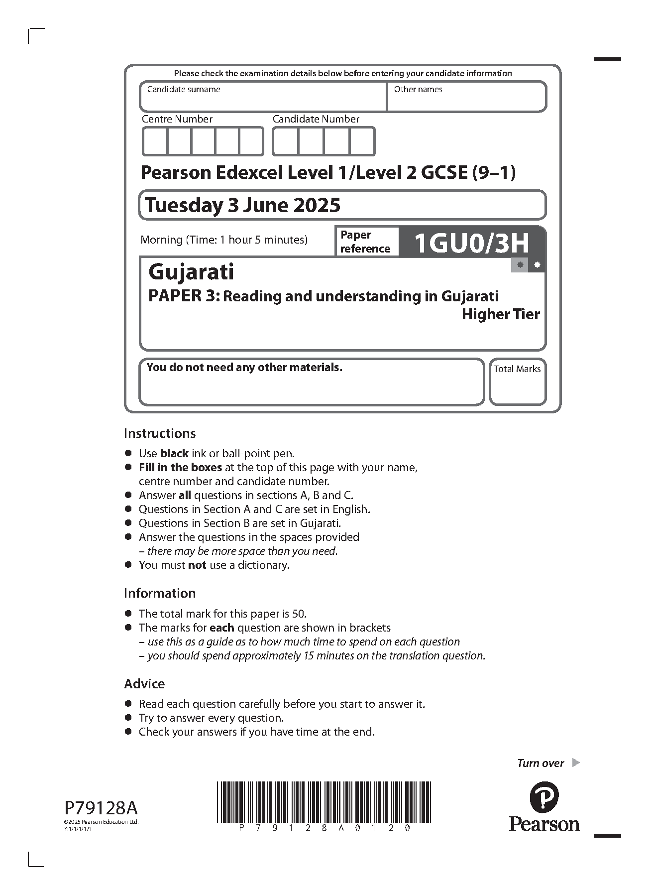 2025 Pearson Edexcel GCSE Gujarati Paper 3H and Mark Scheme Combined (1GU0/3H: Reading and understanding in Gujarati Higher Tier). 2025 Pearson Edexcel GCSE Gujarati Paper 3H and Mark Scheme Combined (1GU0/3H: Reading and understanding in Gujarati Higher Tier) Edexcel