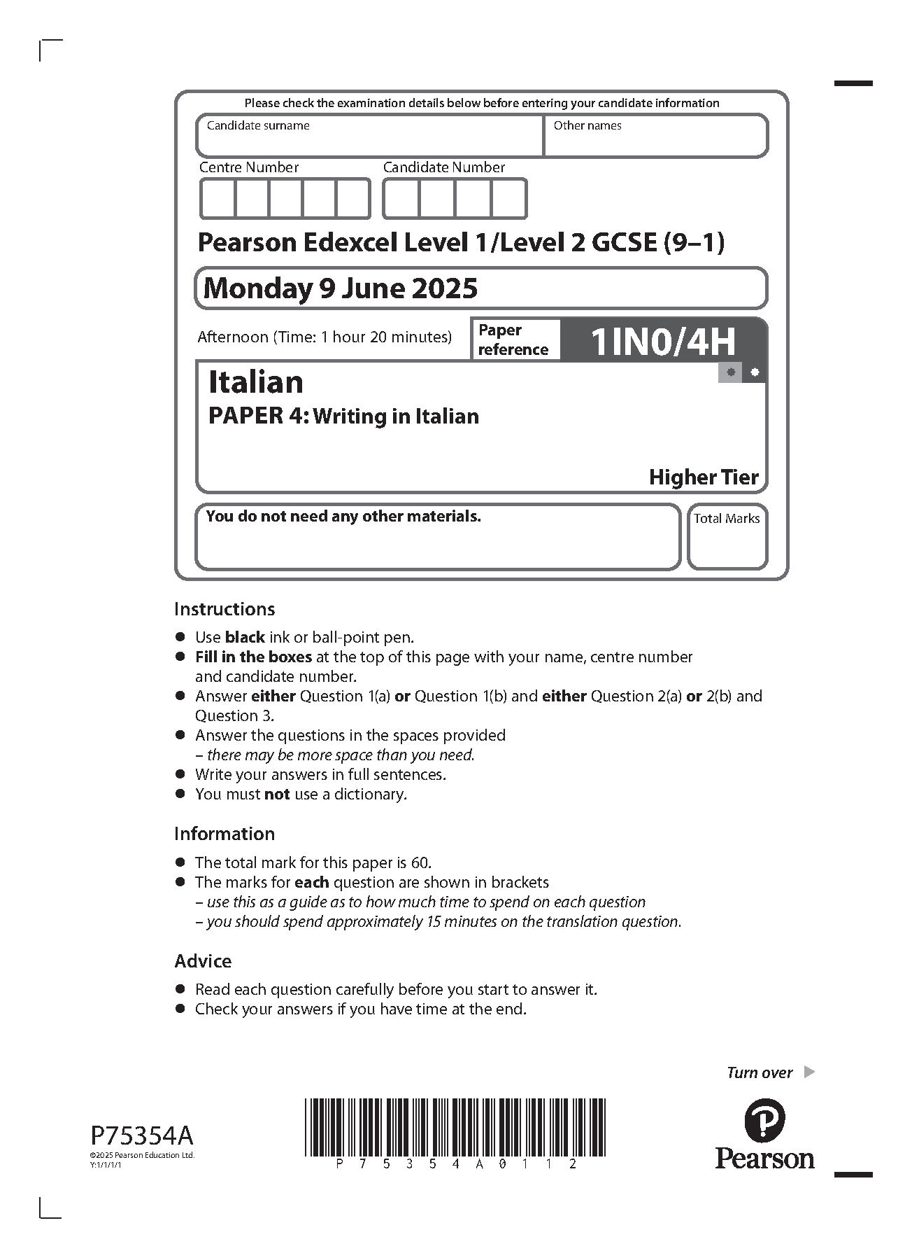 2025 Pearson Edexcel GCSE Italian Paper 4H and Mark Scheme Combined (1GU0/4H: Writing in Italian Higher Tier). 2025 Pearson Edexcel GCSE Italian Paper 4H and Mark Scheme Combined (1GU0/4H: Writing in Italian Higher Tier) Edexcel
