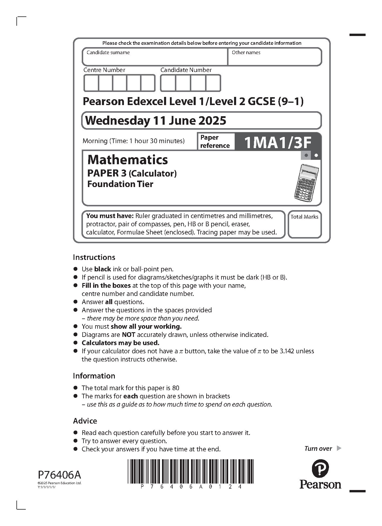 2025 Pearson Edexcel GCSE Mathematics Paper 3F and Mark Scheme Combined (1MA1/3F: Calculator Foundation Tier). 2025 Pearson Edexcel GCSE Mathematics Paper 3F and Mark Scheme Combined (1MA1/3F: Calculator Foundation Tier) Edexcel