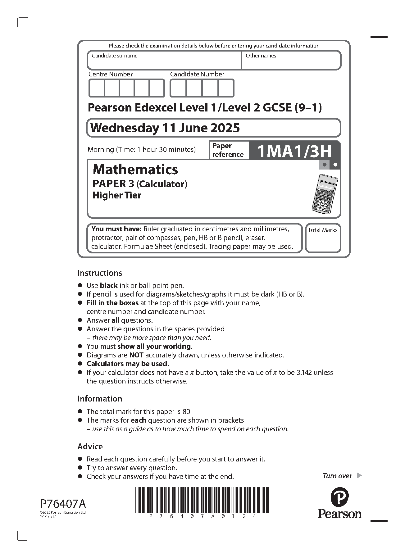 2025 pearson edexcel gcse mathematics paper 3h and mark scheme combined (1ma1/3h: calculator higher tier)