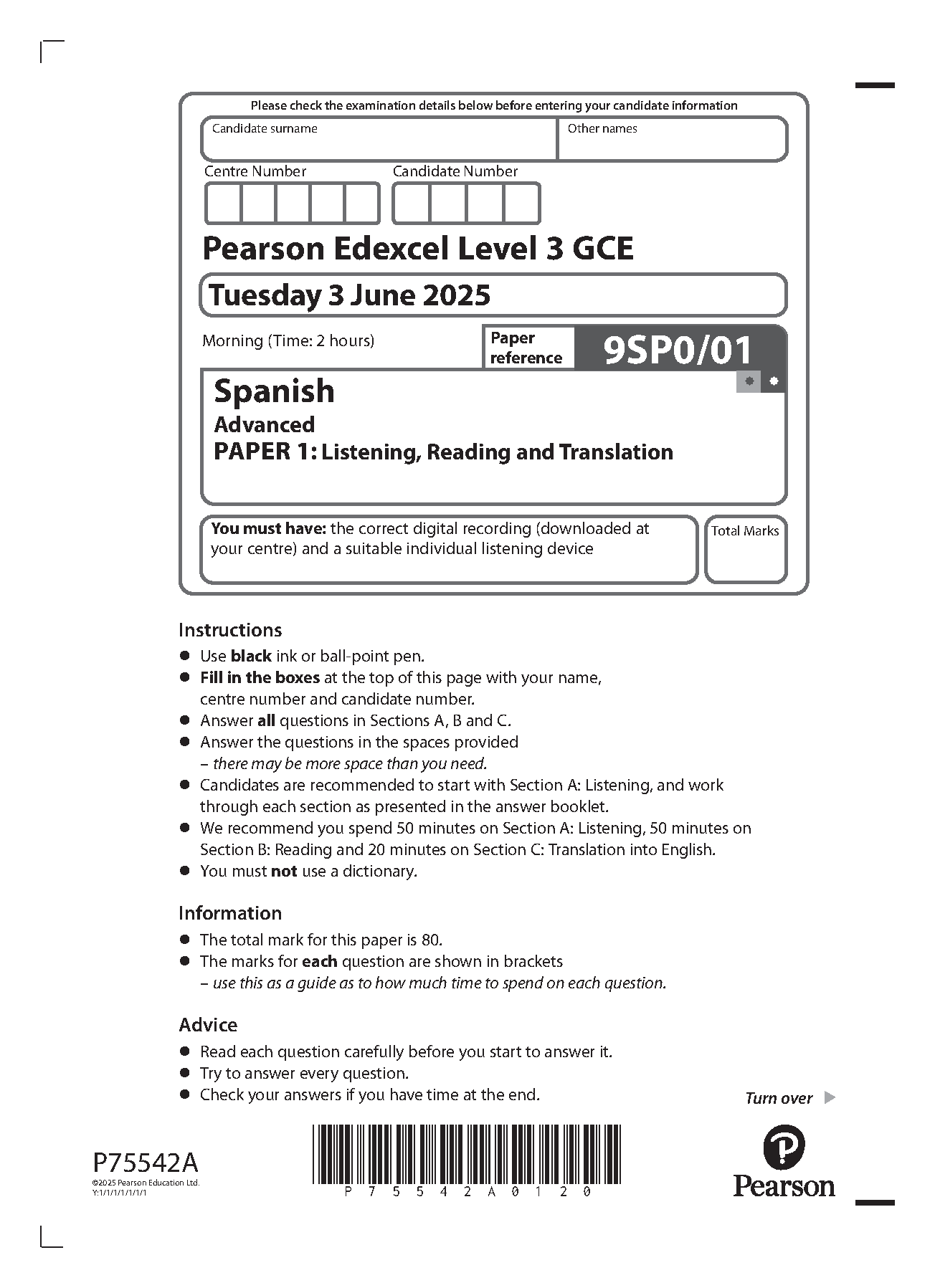 2025 Pearson Edexcel A Level Spanish PAPER 1 and Mark Scheme Combined (9SP0/01: Listening, Reading and Translation). 2025 Pearson Edexcel A Level Spanish PAPER 1 and Mark Scheme Combined (9SP0/01: Listening, Reading and Translation) Pearson Edexcel A and AS Papers and Mark Schemes