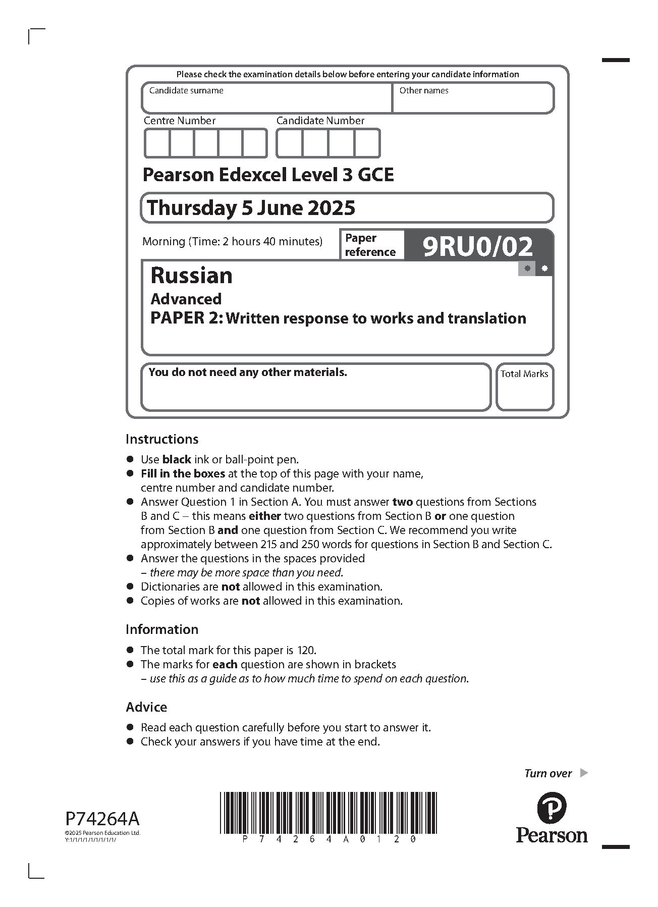 2025 Pearson Edexcel A Level Russian PAPER 2 and Mark Scheme Combined (9RU0/02: Written response to works and translation). 2025 Pearson Edexcel A Level Russian PAPER 2 and Mark Scheme Combined (9RU0/02: Written response to works and translation) Pearson Edexcel A and AS Papers and Mark Schemes