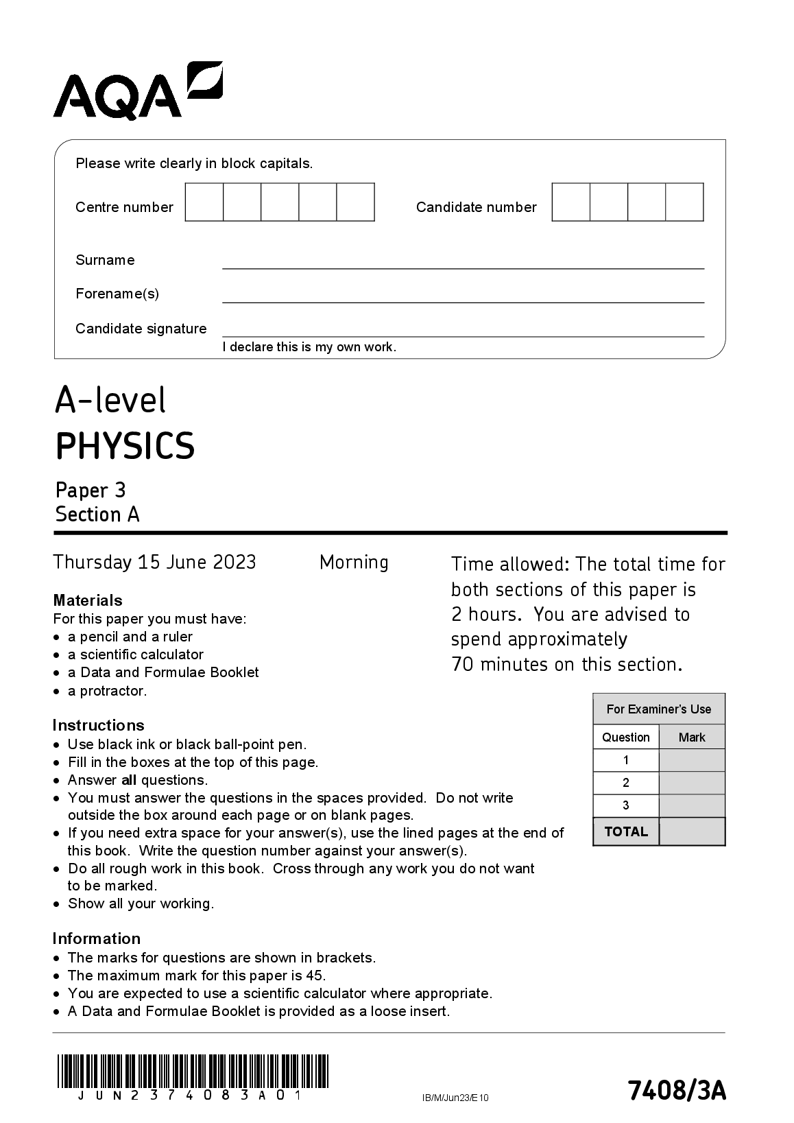 2023 AQA A LEVEL PHYSICS QUESTION PAPER 3(7408/3A;SECTION A).. 2023 AQA A LEVEL PHYSICS QUESTION PAPER 3(7408/3A;SECTION A). AQA Question Papers